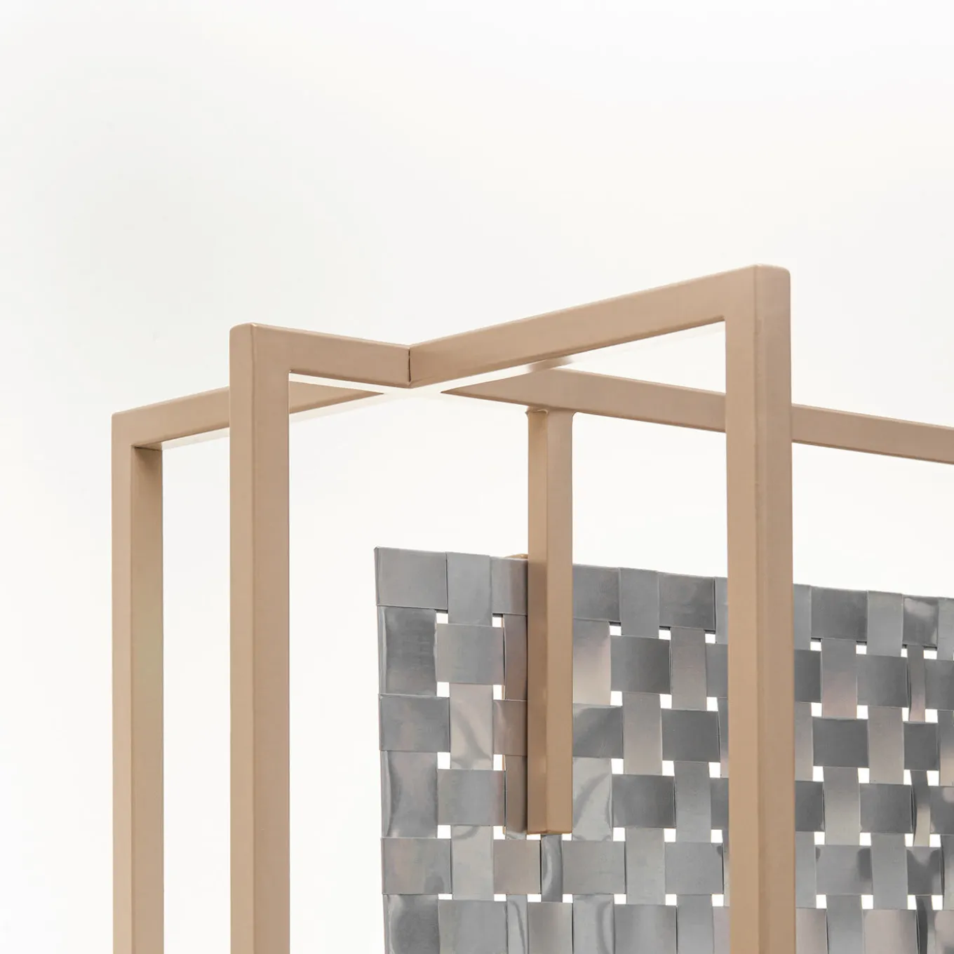 Questo pannello da pavimento a doppia funzione può essere collocato al centro di uno spazio come divisorio, ma anche appoggiato alla parete come sfondo decorativo. La tela intrecciata a mano comprende un foglio di alluminio che conferisce a un lato una lucentezza riflettente, mentre l’altro ha una finitura opaca in oro champagne. Una sottile cornice in ferro color oro completa il look.