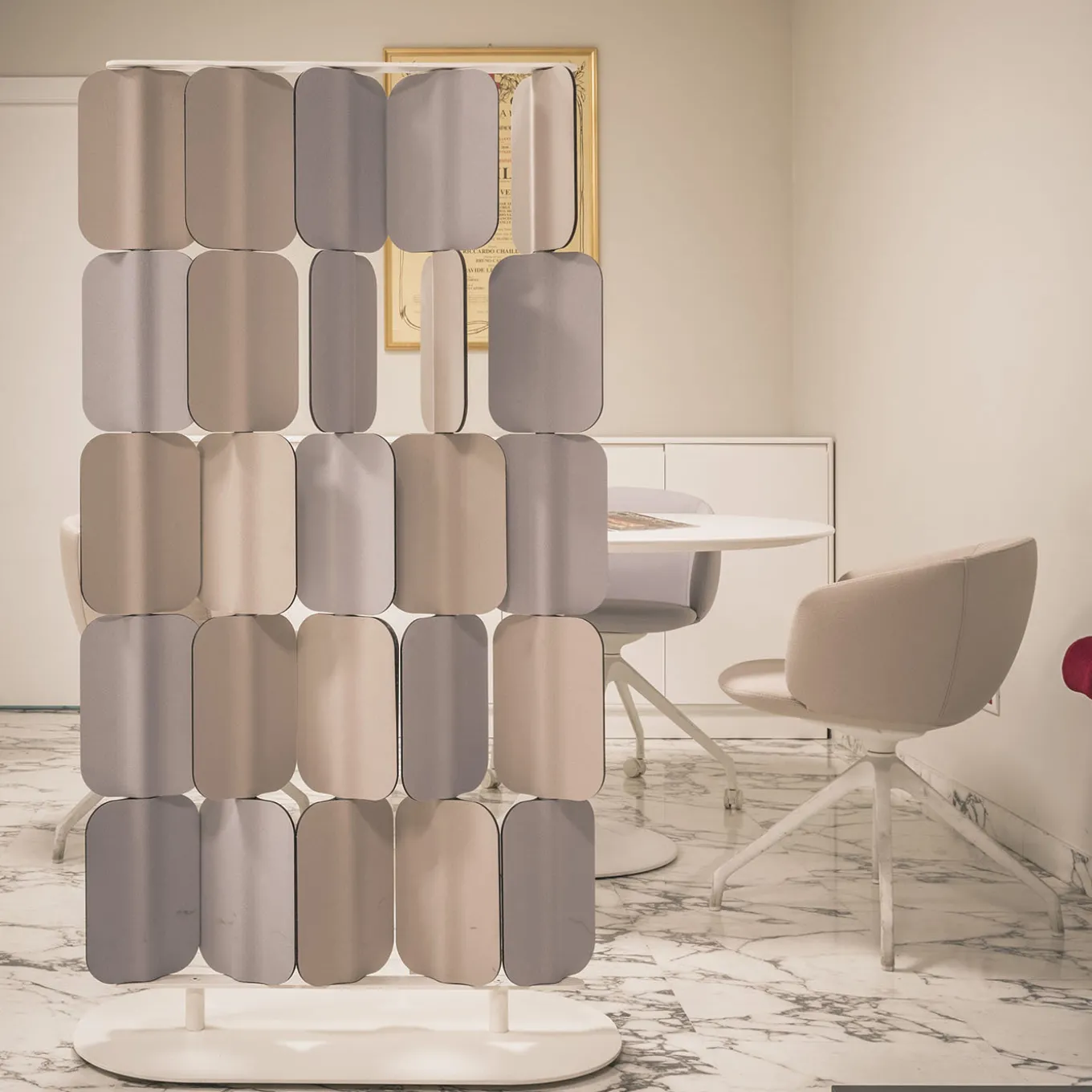 Questo raffinato paravento, che fa parte della collezione Patch, progettata per offrire una privacy visiva e acustica in modo moderno, è perfetto per uffici, sale d’albergo e loft open space multifunzionali. La struttura indipendente è composta da una base e da un telaio tubolare in acciaio con finitura bianca e da cinque elementi verticali di mini-pannelli fonoassorbenti. Realizzati in poliestere multistrato e tessuto bianco, crema e grigio chiaro, i pannelli possono essere ruotati manualmente per controllare la direzione del suono e regolare la quantità di privacy visiva desiderata. Disponibile anche nella versione a soffitto.