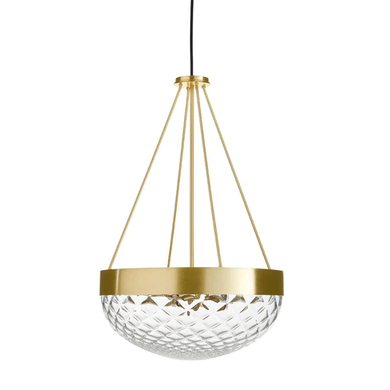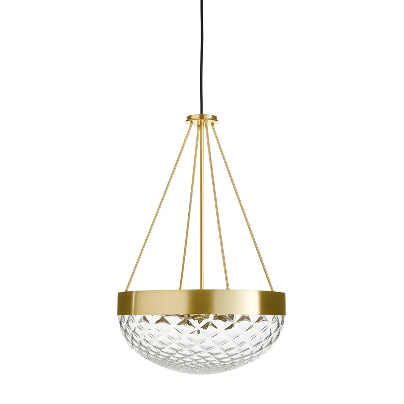 Adatto come lampada da tavolo o a sospensione, questo pezzo accattivante di Matteo Zorzenoni sviluppa il design del paralume di una plafoniera tradizionale e lo reinterpreta in una chiave accattivante e contemporanea. Il paralume, che ospita tre lampadine, è in vetro di Murano soffiato a bocca con una raffinata texture romboidale ed è completato da una struttura in metallo con finitura in ottone satinato. È disponibile anche una finitura nera opaca. Su richiesta, sono disponibili le certificazioni per il settore contract e commerciale.