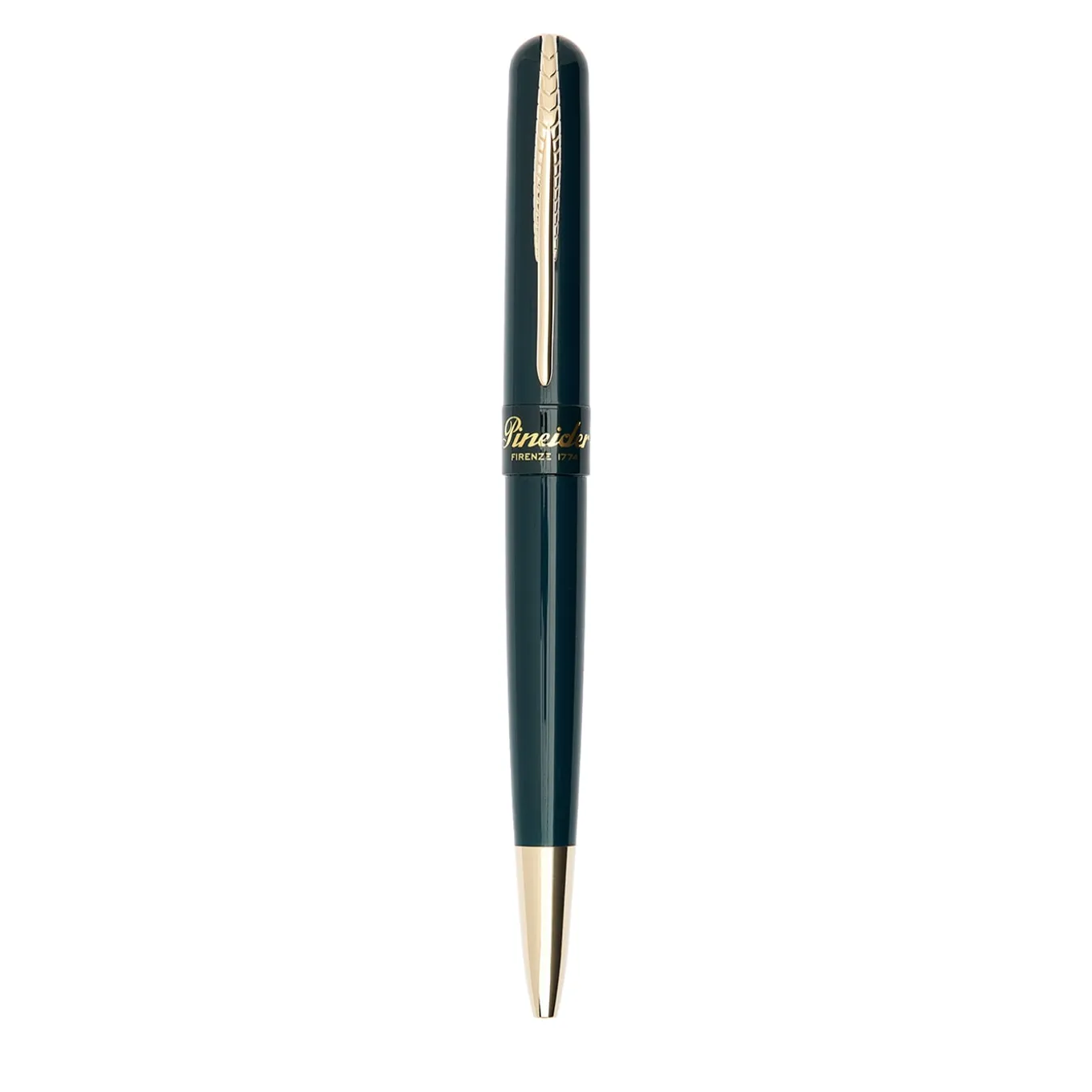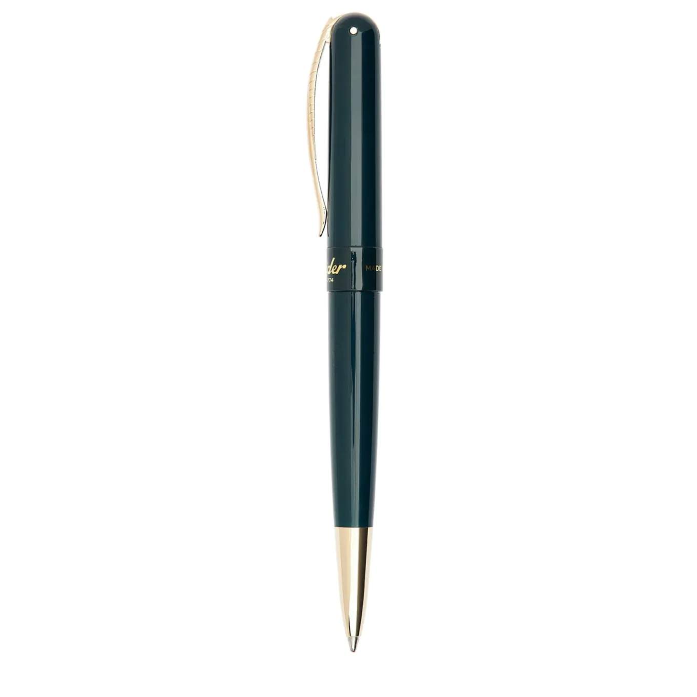 Il corpo verde intenso di questa penna a sfera, impreziosito da radiose finiture dorate, emana una raffinatezza senza tempo. La sua ricca tonalità, che ricorda le foreste lussureggianti, è esaltata da una finitura lucida che cattura la luce in modo splendido. La clip in oro finemente incisa aggiunge un dettaglio raffinato, perfetto per essere infilato in modo sicuro nelle tasche o nei quaderni. Compatta e resistente, unisce una scrittura fluida e precisa all’eleganza, rendendola ideale per i professionisti che apprezzano un pezzo audace ma classico.
