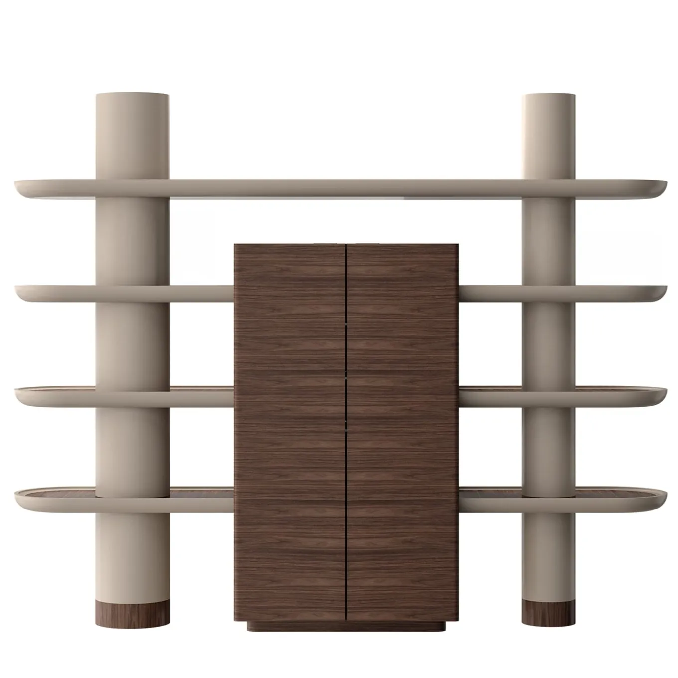 Maestoso e raffinato, questo pensile è stato concepito come una soluzione artistica ed elegante che funge contemporaneamente da libreria e da mobile. Quattro ampi ripiani scanditi da estremità curve sono tenuti insieme da audaci colonne in tinta, le cui basi sono impreziosite dallo stesso prezioso noce canaletto che caratterizza il mobile centrale a due ante. Dotato di ripiani in legno e vetro, l’interno vanta un esclusivo sistema di illuminazione a LED.