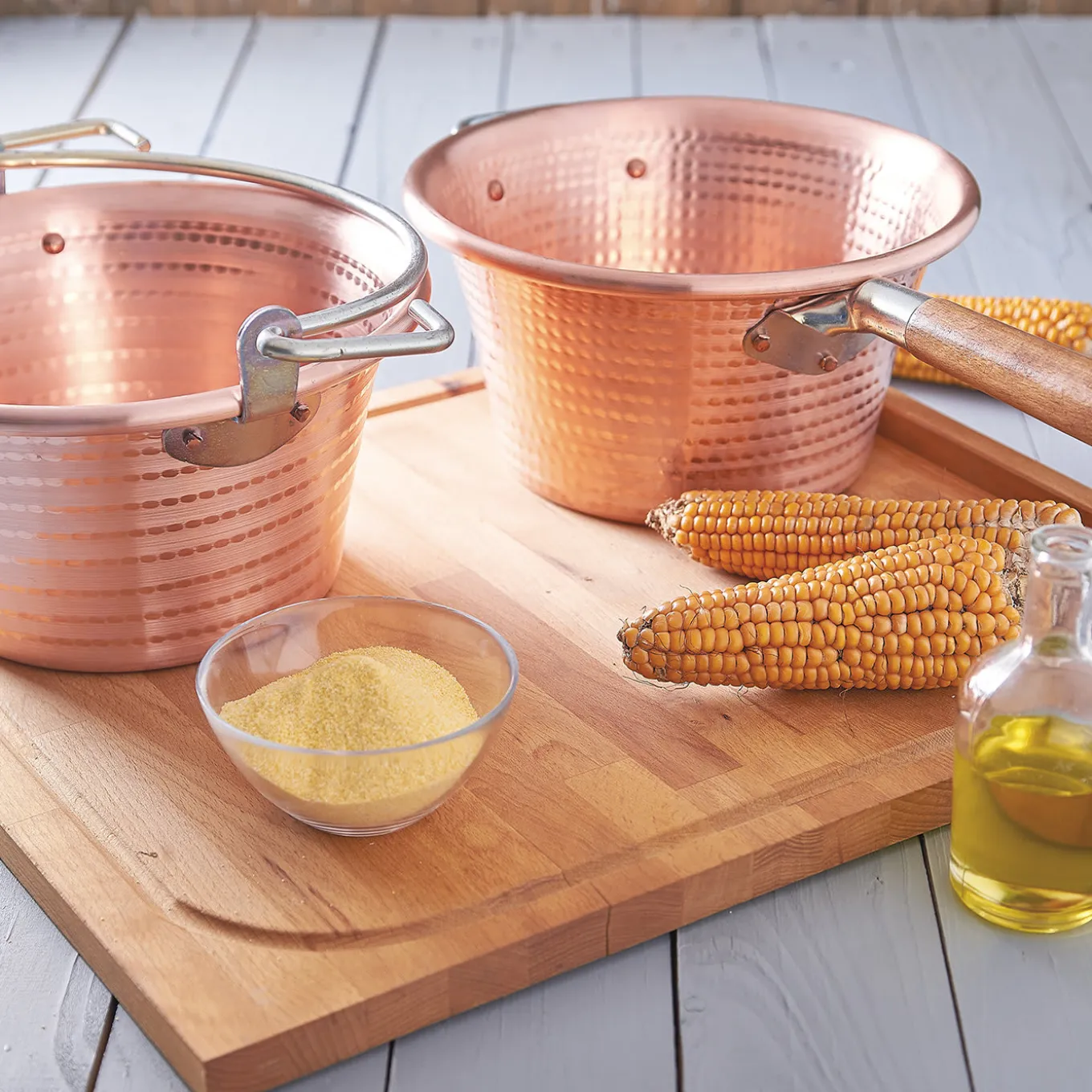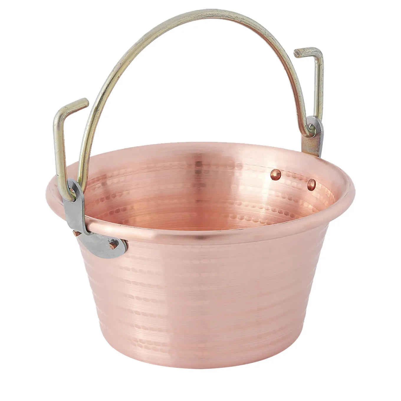 Immancabile in una cucina gourmet ben attrezzata, questo paiolo a induzione è stato progettato specificamente per la cottura della polenta, una specialità spesso utilizzata come sostituto di pane e pasta nella cucina tradizionale del Nord Italia. Realizzato in rame con una classica finitura martellata, la sua forma profonda (capacità di 4,6 litri) e i lati arrotolati favoriscono un frequente rimescolamento per mantenere la polenta umida e ben cotta. Un manico ad anello in ferro ramato è aggiunto ai lati con rivetti da 5 mm. I prodotti possono presentare imperfezioni dovute alla lavorazione artigianale.