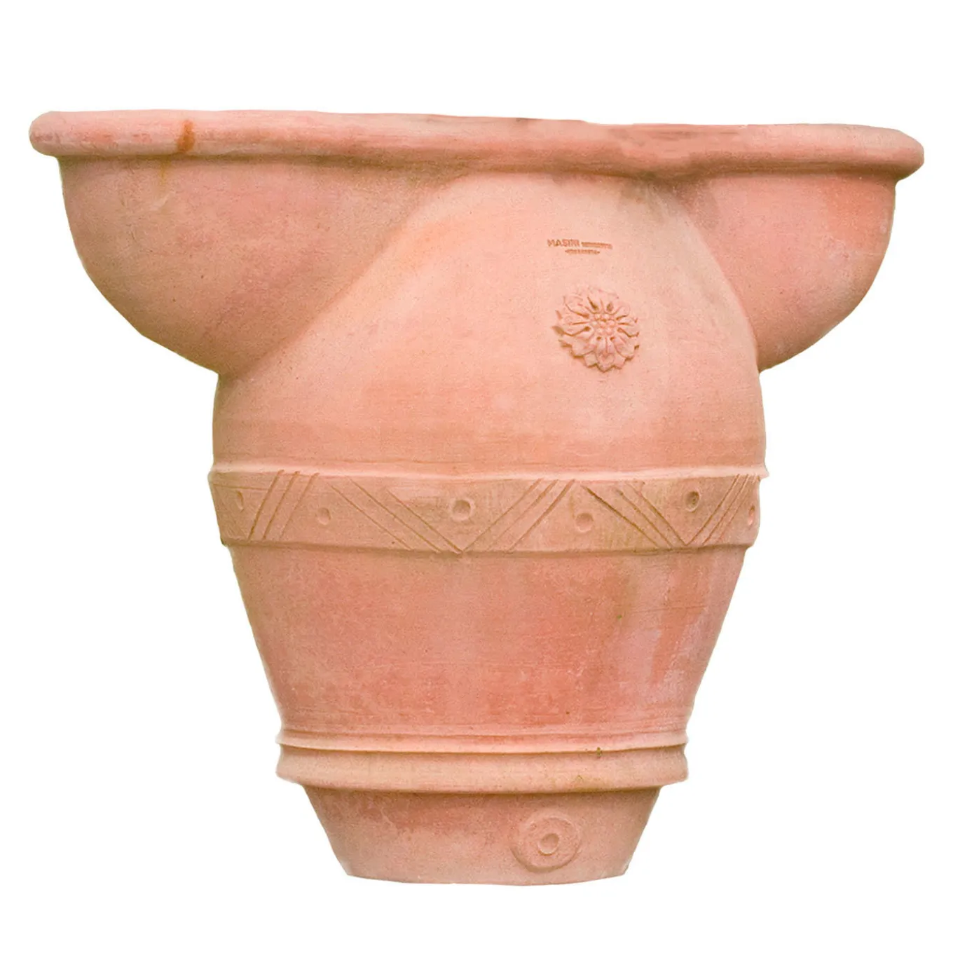Tanto estroso quanto funzionale, questo generoso vaso è il risultato dell’esperienza di maestri ceramisti specializzati nella lavorazione della terracotta imprunetina, resistente al gelo. Due forme audaci si estendono dalla parte superiore, creando tre bocche adiacenti ma distinte per piantare fiori o piante rigogliose. Sobrie fasce e decorazioni minimaliste impreziosiscono il design. Certificato CAT.