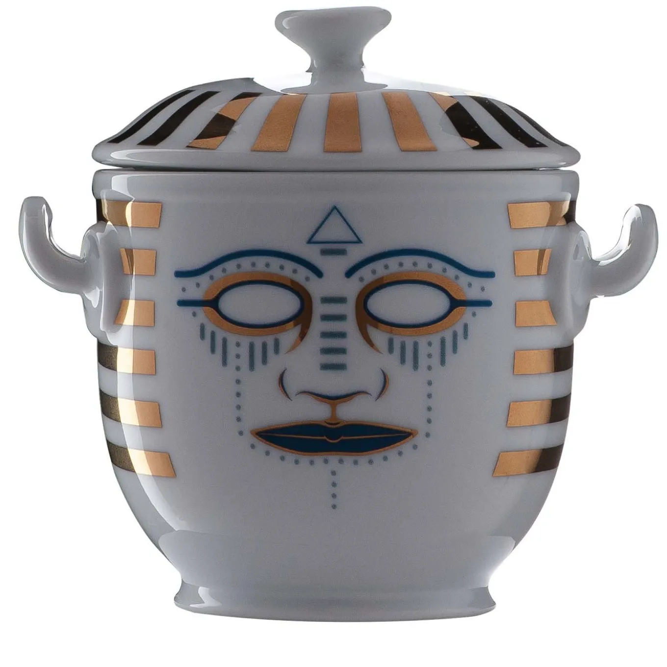 Basato sull’originale “rinfrescatoio” di Geminiano Cozzi destinato a mantenere freschi in tavola frutta e altri alimenti, questo raffinato pezzo è composto da tre elementi: fondo, coperchio a forma di cupola e ciotola per mantenere a temperatura ottimale caviale, frutta o prelibatezze. Parte della collezione Ethnics, disegnata da Gianpiero Mastro, questo pezzo si ispira alle antiche maschere di diverse culture; dietro c’è un’attenta ricerca di colori ed elementi stilistici, secondo i canoni di Geminiano Cozzi che crea un connubio tra l’antica tradizione veneziana della porcellana e le culture di questo mondo sempre più globale accompagnando il “rinfrescatoio” in un percorso che lo trasforma in oggetto di culto e collezione.