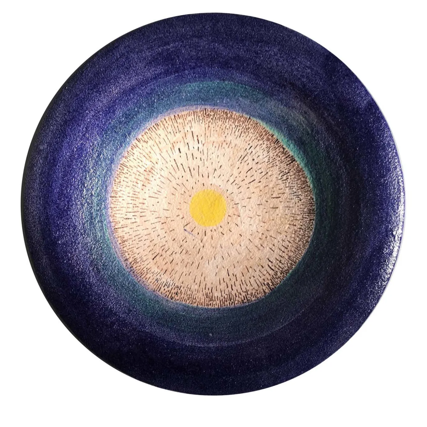 Fresca e originale, questa affascinante placca da parete aggiungerà un tocco creativo a qualsiasi parete scelta. Dal design leggermente svasato, ha un diametro di 45 cm ed è rifinito in smalto vitreo. Questo particolare motivo è caratterizzato da un bordo blu che degrada leggermente verso il centro. Da una sfera centrale gialla fuoriescono piccole macchie, quasi come un sole che si irradia.
