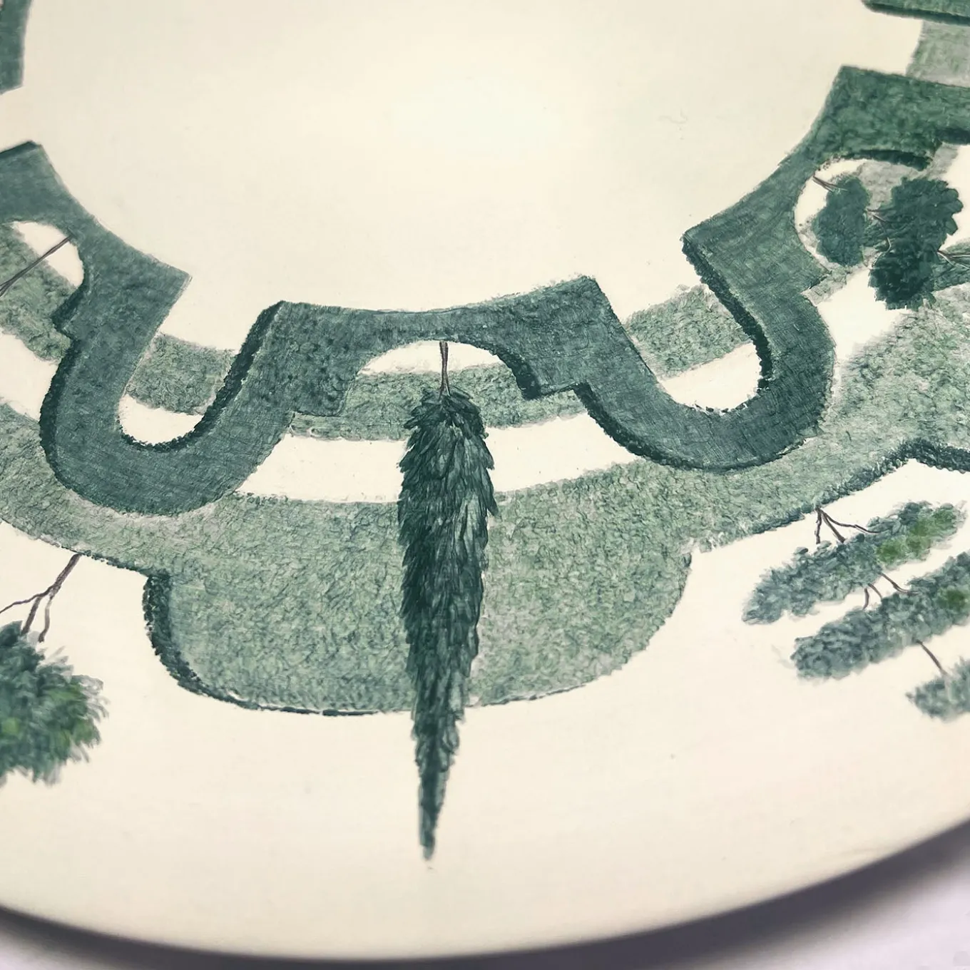 Il sottopiatto rotondo Jardin à l’Italienne in tonalità verde cattura l’essenza di un paesaggio metafisico, dove la vegetazione si trasforma in forme architettoniche. Il motivo dettagliato del fogliame avvolge il piatto, creando un’atmosfera sospesa e senza tempo. Pensato per valorizzare la presentazione a tavola, questo sottopiatto unisce stile ed eleganza, perfetto per apparecchiature raffinate.