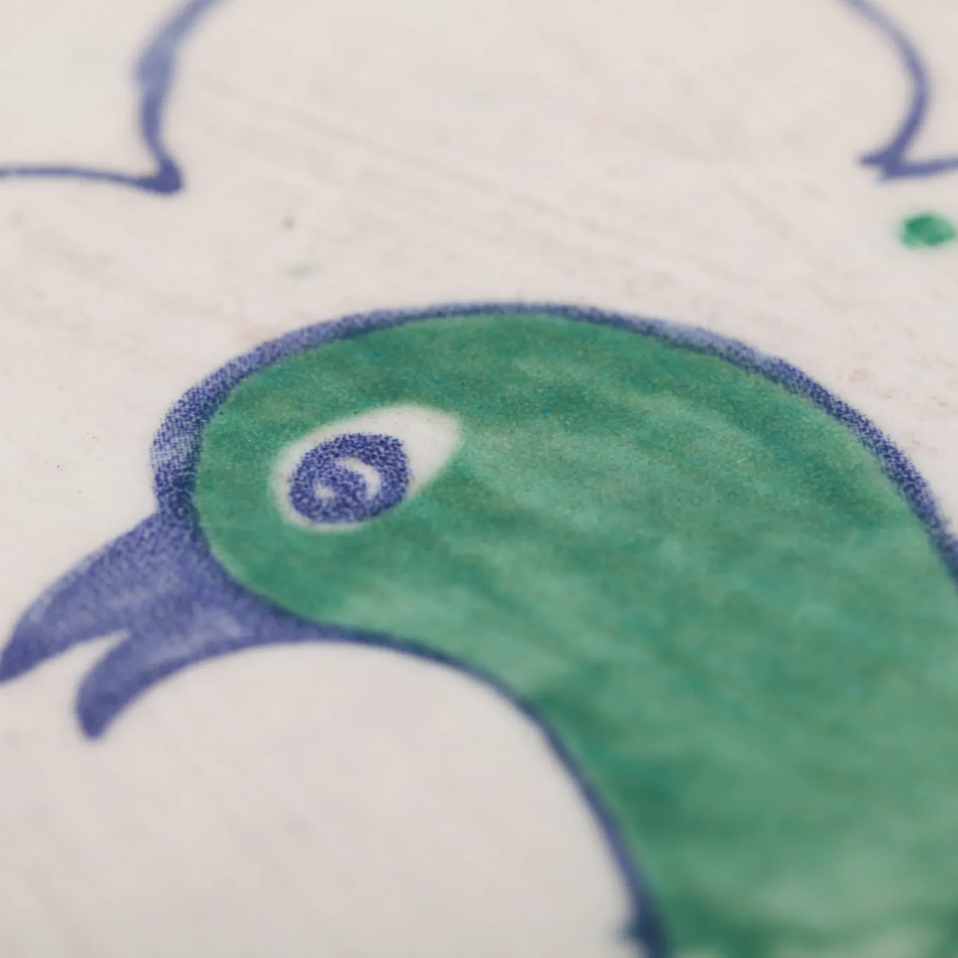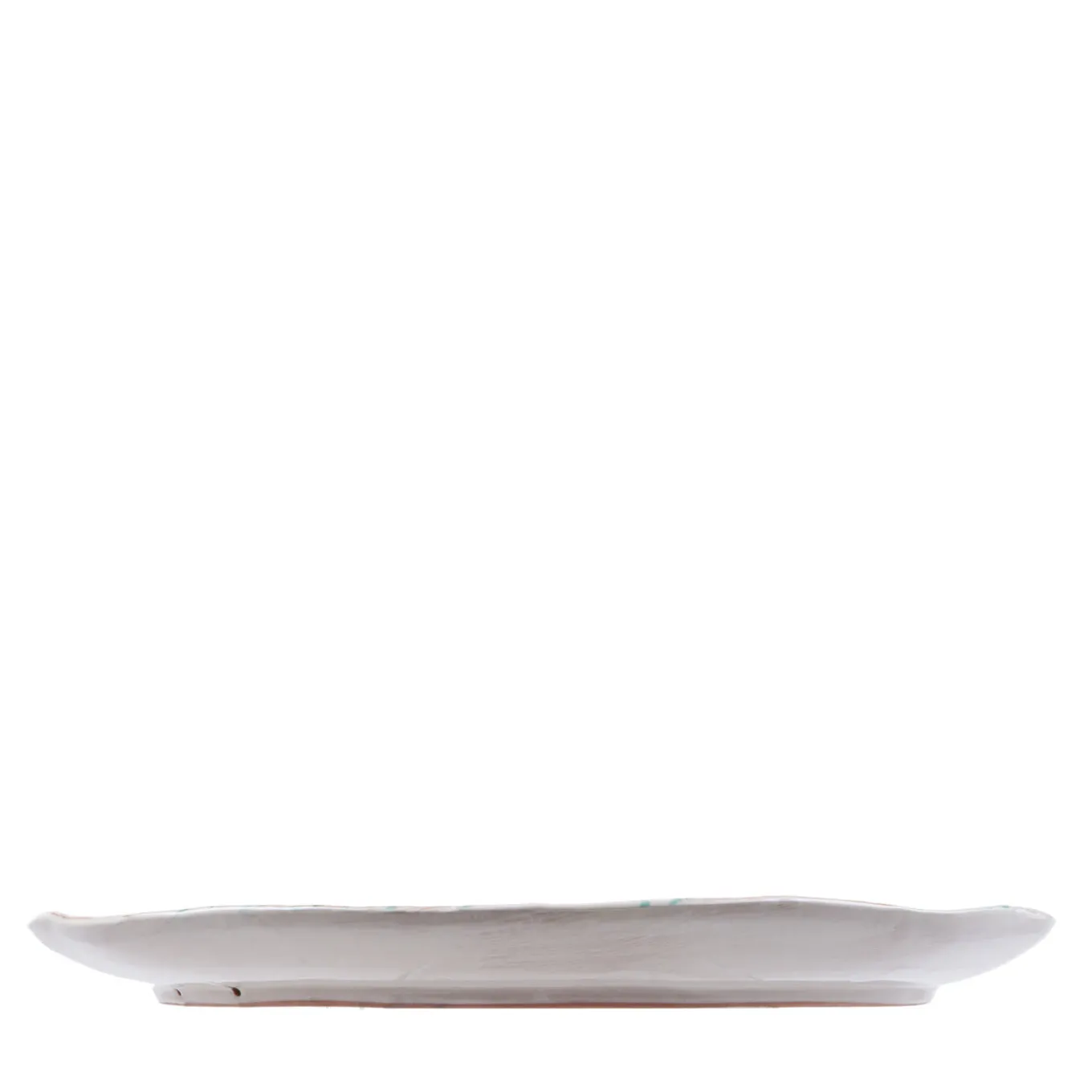 Un originale disegno di pavone emerge nelle tonalità dell’acqua su questo grande piatto in ceramica interamente lavorato a mano modellando la particolare terra rossa. I maestri ceramisti toscani di Nuove Forme hanno concepito questo pezzo tradizionale come piatto da portata.