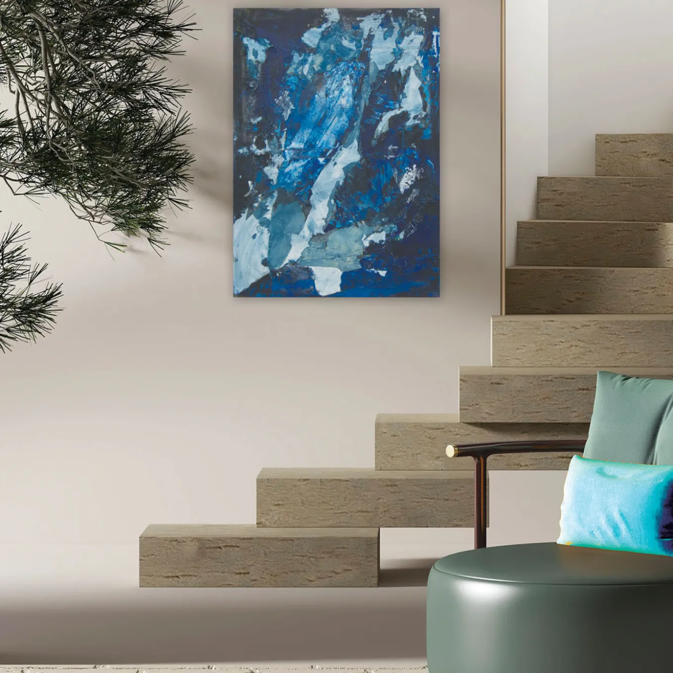 Sfumature di pittura acrilica blu e inchiostro nero illuminate da dinamiche pennellate di luce evocano le atmosfere notturne – con le sue luci sottili e le variabili meteorologiche – che questo dipinto evoca attraverso i suoi tratti astratti. Lo strato di carta velina che ricopre la tela accoglie i colori, conseguentemente schiariti per un poetico impatto cromatico. L’opera viene consegnata senza cornice e viene fornita con un certificato di autenticità.