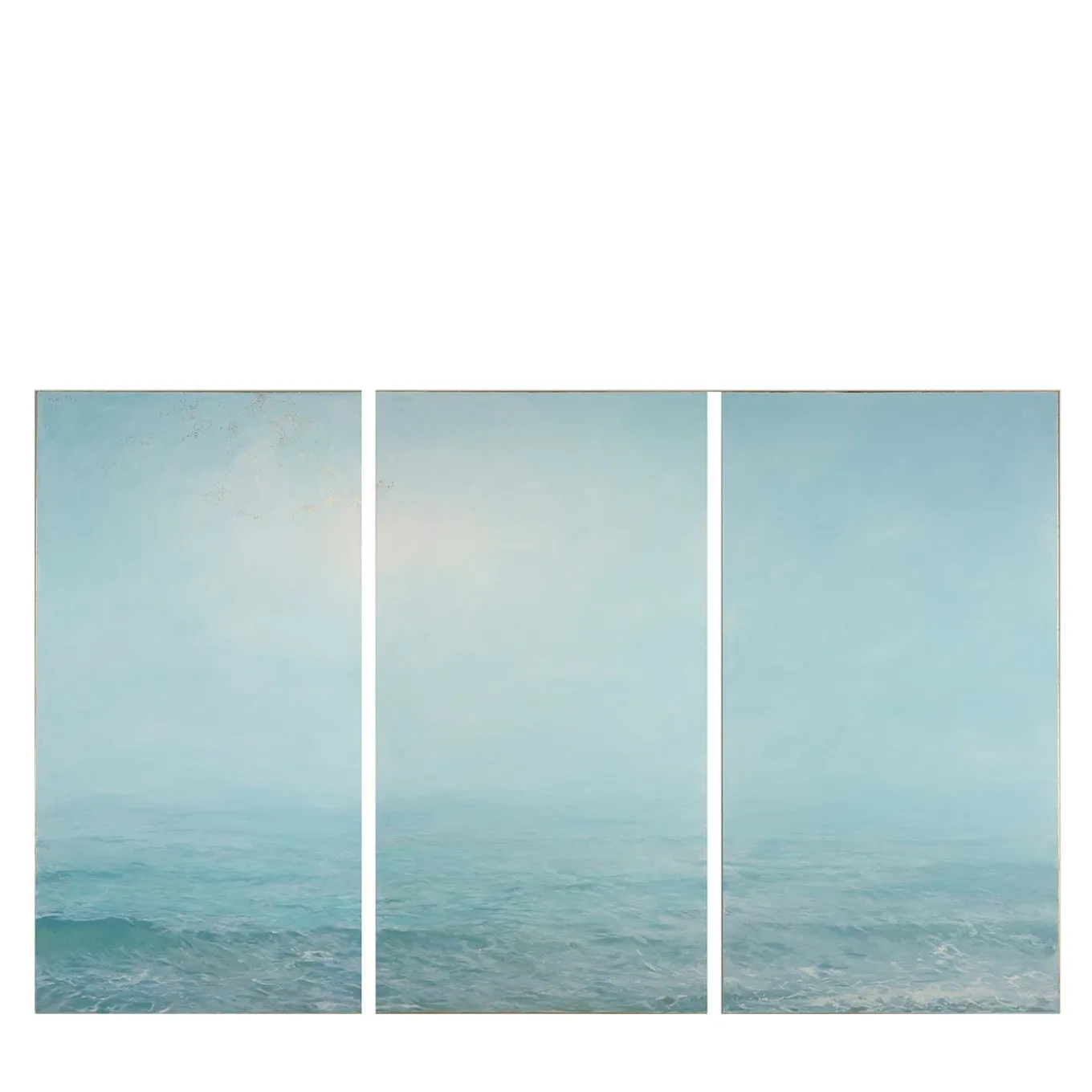 Il rumore del mare che si infrange, l’odore della salsedine, gli spruzzi sulla pelle – i sensi, la vita – si allontanano mentre le onde che respirano si riducono nella nebbia, verso l’ignoto. Decorato con uccelli dorati a 24 carati. Anche i lati di questo splendido trittico sono dorati, in modo da illuminare la parete. Si tratta di un dipinto a olio su pannello di legno.