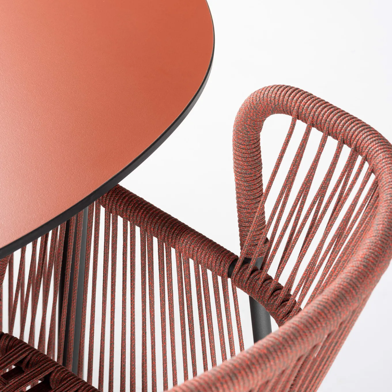 Ideale da riunire con i gemelli intorno al tavolo rotondo grigio Altana per un look coerente, questa poltrona sintetizza comfort e femminilità. Linee dinamiche, che incorporano anche lo schienale avvolgente e i braccioli lineari, tracciano il profilo della sua struttura in acciaio verniciato a polvere color antracite, che vanta un seducente disegno traforato di corde nautiche rosa intrecciate a mano. È sicuro per l’uso all’aperto.