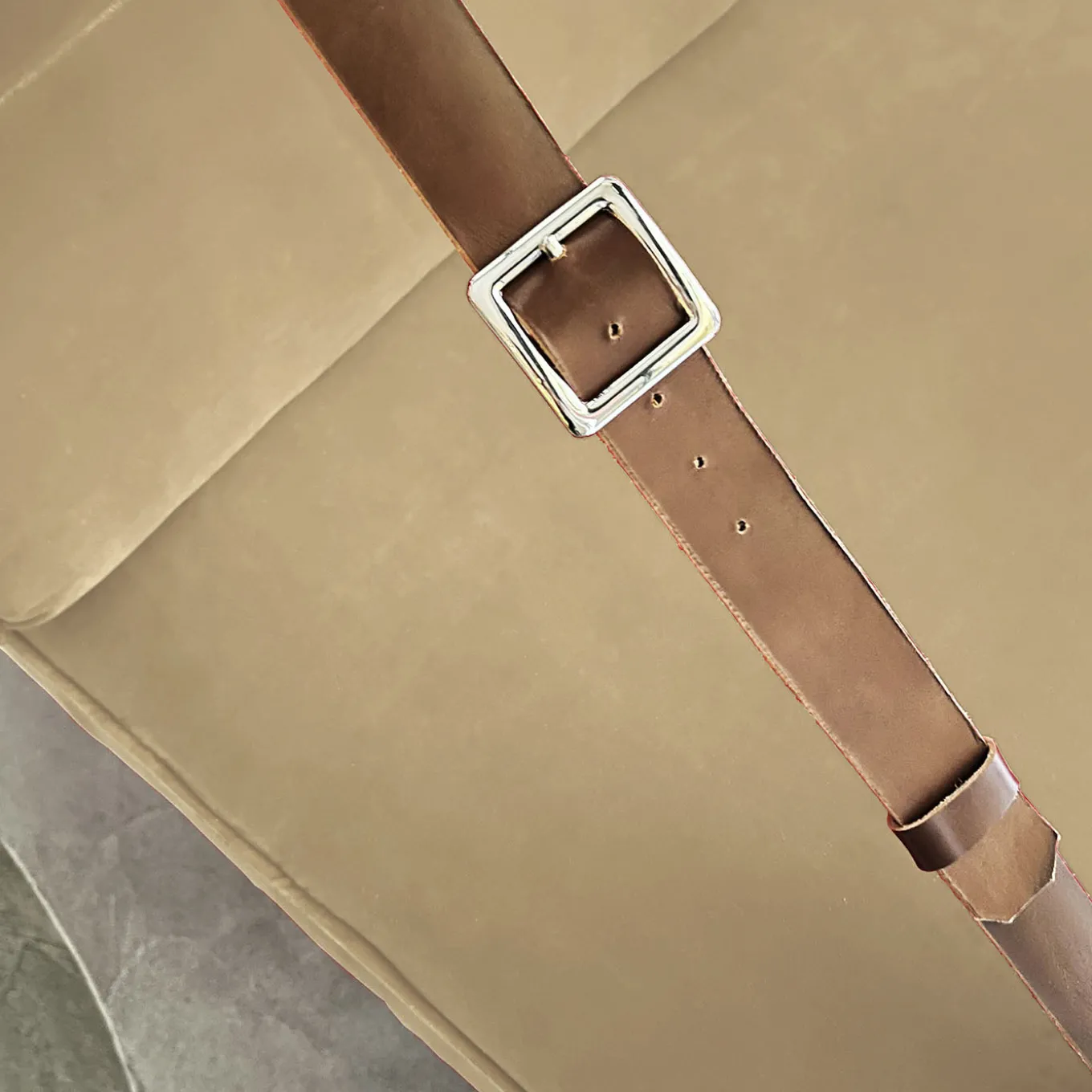 Questa poltrona, definita dal suo tessuto ecologico “bio-cotton”, incarna il lusso con un tocco sostenibile. Il suo morbido velluto in una tonalità beige neutra valorizza qualsiasi ambiente, offrendo un’estetica calma e sofisticata. La poltrona rende omaggio ai nostalgici trasporti di merci al porto di Genova, evocando ricordi di viaggio. È personalizzabile in varie dimensioni e finiture e offre anche una versione per esterni con cinghie in pelle e molteplici opzioni di tessuto, per una versatilità che si adatta a qualsiasi ambiente.