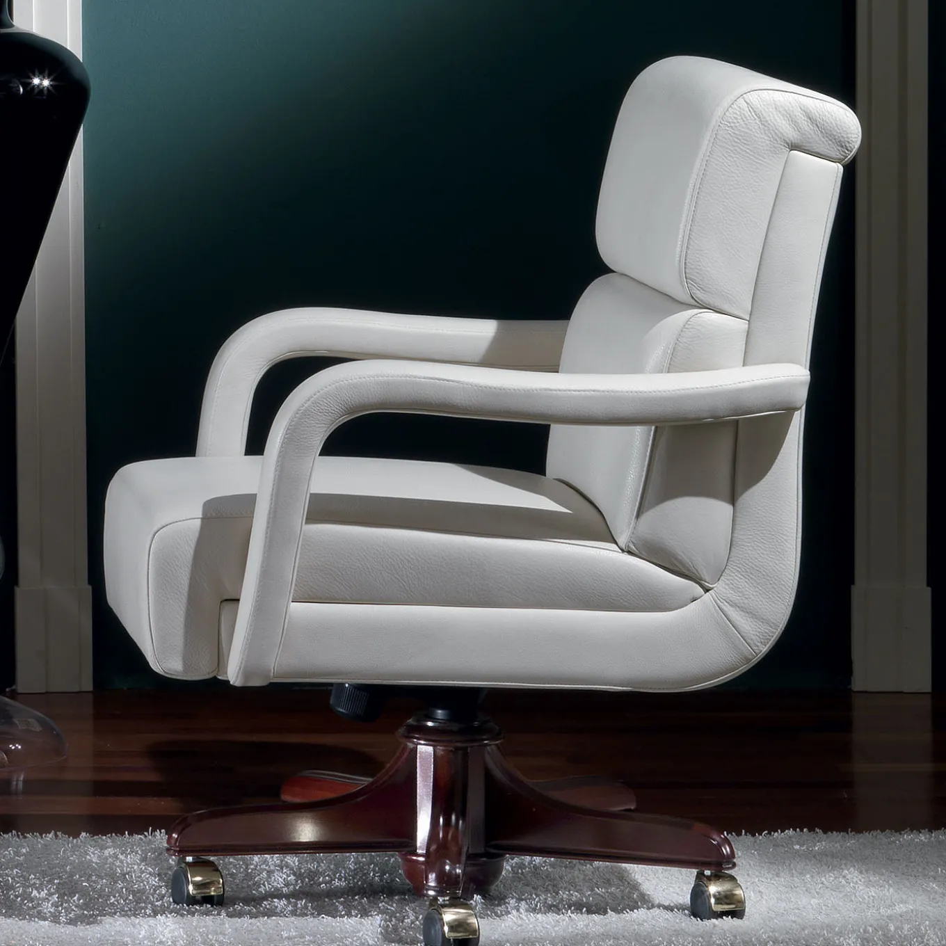 Poltrona girevole di lusso in stile classico con struttura in legno di faggio. L’altezza del sedile è regolabile e il meccanismo di oscillazione aiuta a mantenere una gamma completa di movimenti, bilanciando la postura. È imbottita con fettucce e schiuma di qualità superiore. Il rivestimento esalta particolarmente il lusso di questo modello e sottolinea il design avvolgente: la pelle di toro conciata riflette un’eleganza riservata. Sono disponibili altri colori di pelle, contattando il nostro Concierge.