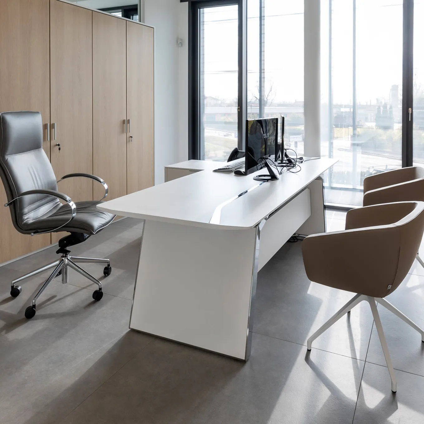 L’elegante poltrona direzionale imbottita è caratterizzata da uno schienale alto e da una base a 5 razze, che può ruotare e muoversi verso l’alto e verso il basso. I braccioli fissi sono dotati di cuscinetti imbottiti.