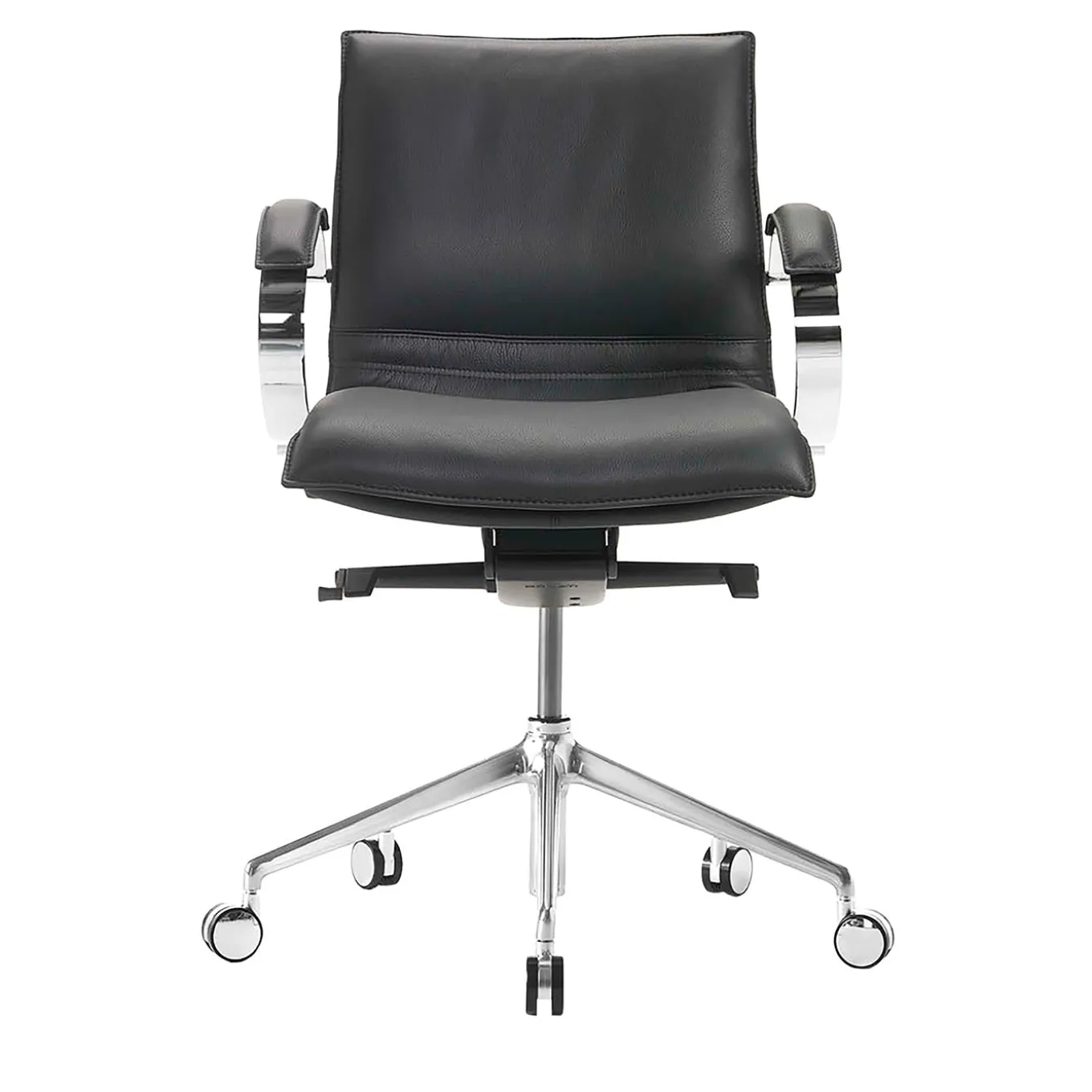 Questa elegante poltrona visitatore imbottita è caratterizzata da uno schienale centrale e da una base a 5 razze, che può essere girevole e muoversi su e giù. È arricchita da braccioli fissi con cuscinetti imbottiti.