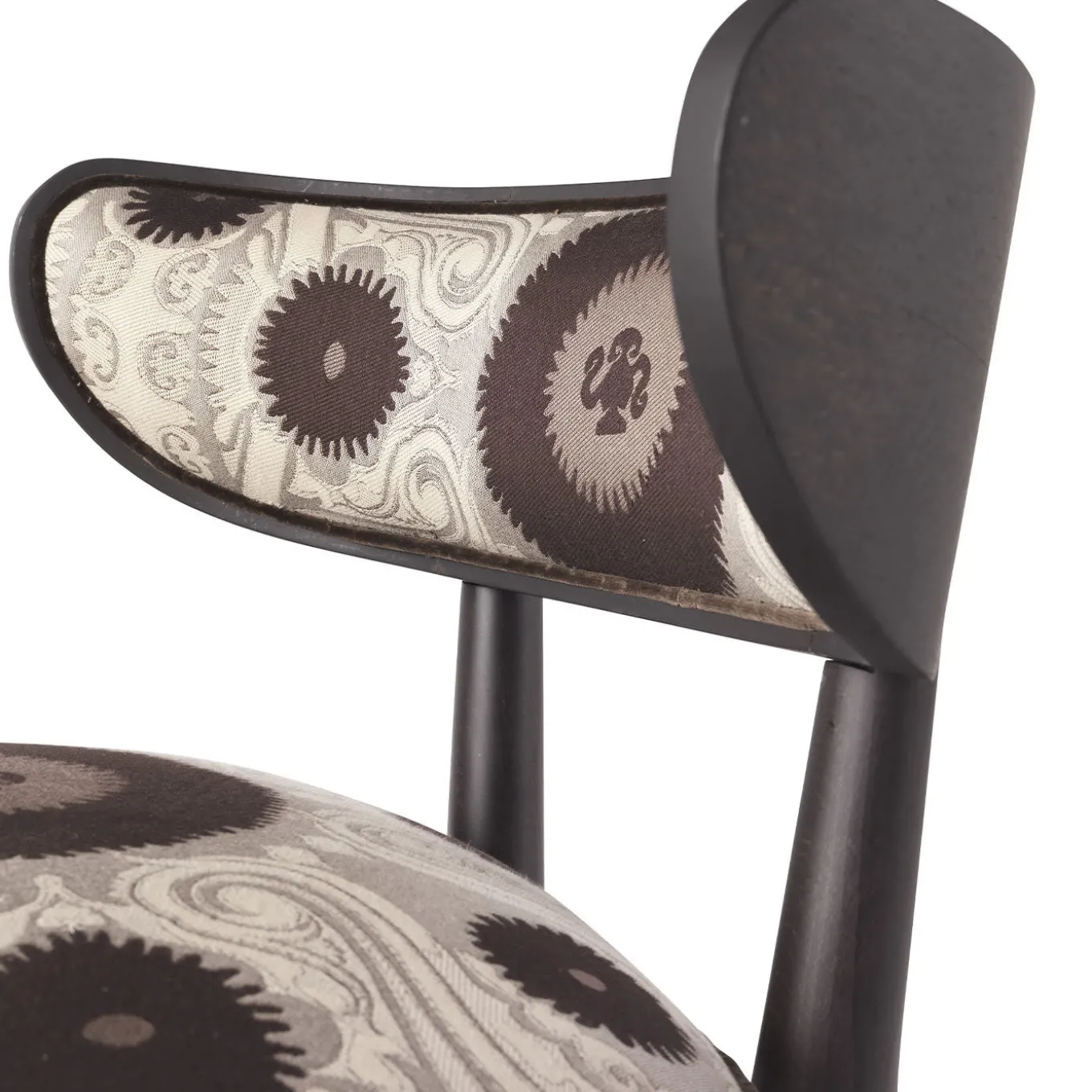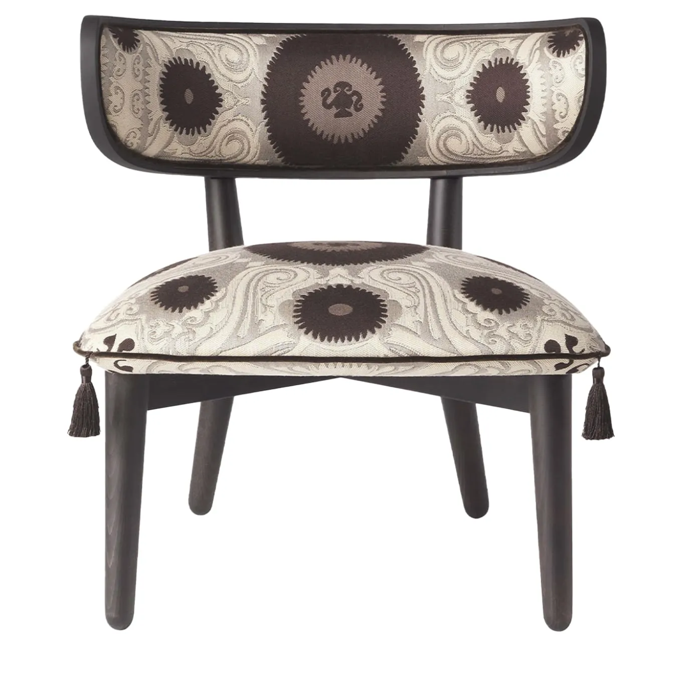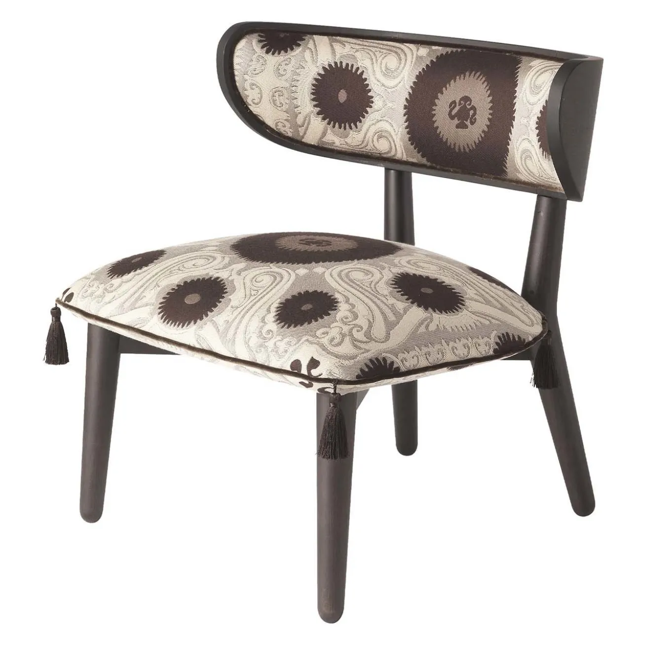 Una poltrona accogliente ed evocativa che celebra l’anima eclettica di Etro Home Interiors. L’ispirazione etnica, già presente nel nome che rimanda ai re della tradizione persiana, si ritrova nel cuscino appoggiato sulla seduta, che richiama i pouf ottomani, nelle linee essenziali della struttura in legno scuro e nel rivestimento in tessuto Bukhara, con ricami decorativi tribali, presentato quest’anno in una nuova variante di colore. Il carattere istituzionale si ritrova nel dettaglio del Pegaso, il cavallo alato, storico simbolo del marchio, applicato sullo schienale. Le nappe di seta sui cuscini di seduta aggiungono un tocco classico, confermando la personalità versatile della poltrona. Poltroncina con struttura in legno tinto wengè scuro opaco. Seduta e schienale in espanso con rivestimento in tessuto Bukhara/Fumo. Piping in velluto Venezia/Moka e nappe in seta abbinate. Pegaso decorativo in ottone lucido sul retro dello schienale. Per le personalizzazioni rivolgersi al Concierge.