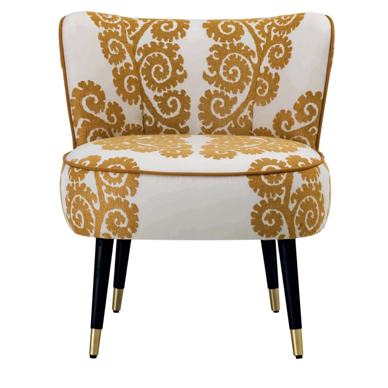 Questa sedia imbottita di classe e originale è caratterizzata da gambe in noce scuro con puntali in metallo verniciato ottone o bronzo. La seduta e lo schienale sono in legno e sono imbottiti con schiuma ad alta resistenza e densità variabile con inserto in poliuretano. Il rivestimento non può essere rimosso.
