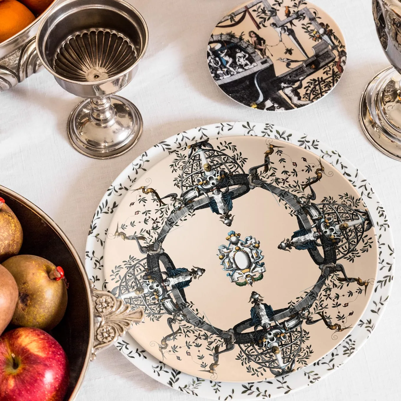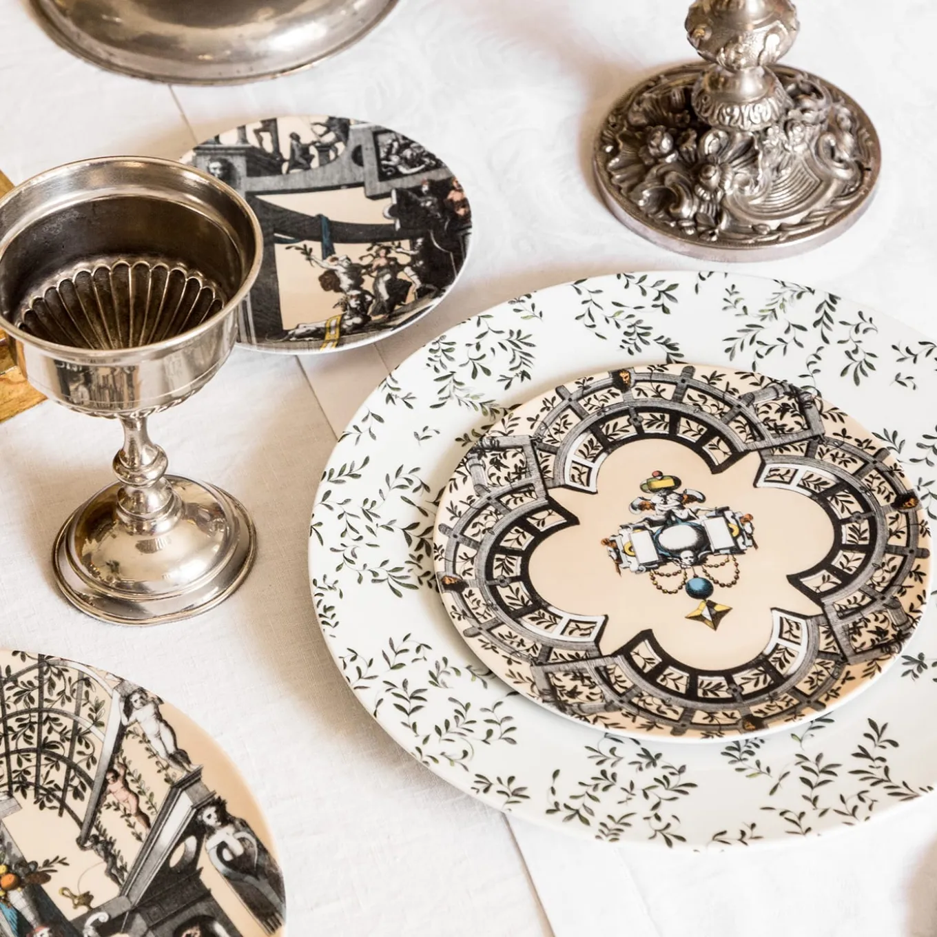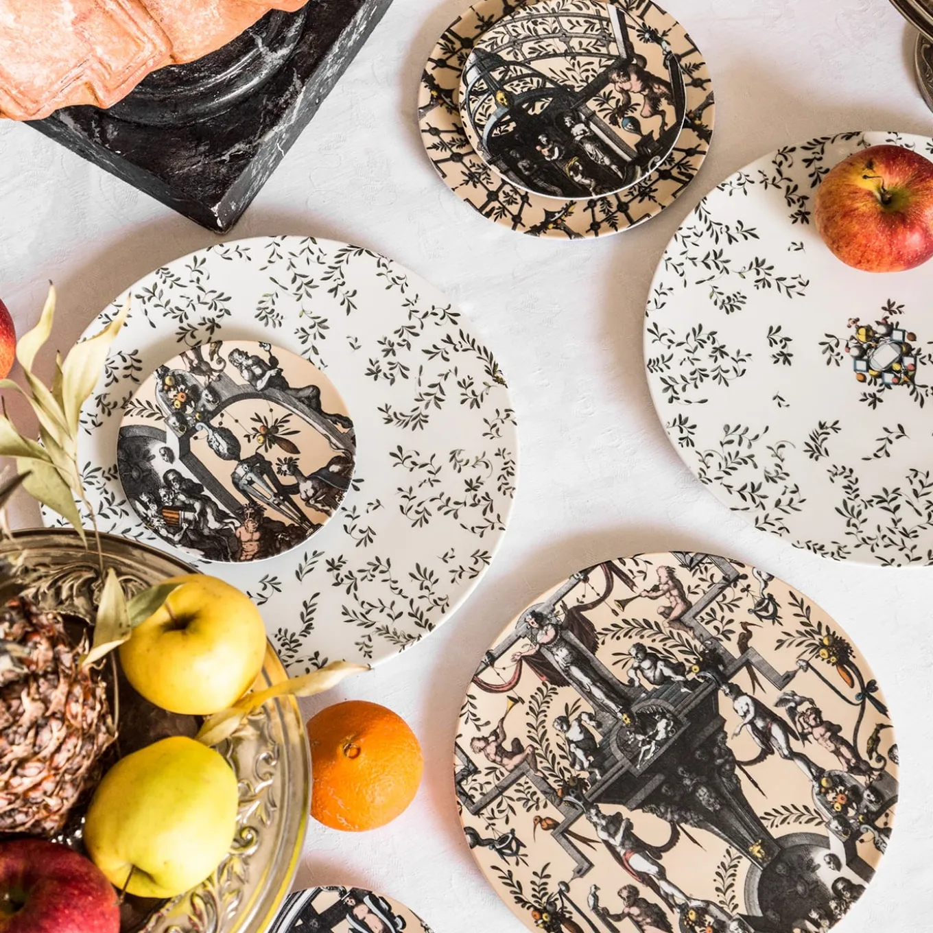 La nuova collezione di porcellane Pompei riporta in auge la decorazione murale grottesca in chiave contemporanea. Disegni antichi vengono ripresi e declinati sui diversi formati della mise en place in modo da creare giochi di sovrapposizioni eleganti e unici. Elementi naturali, figure antropomorfe, gioielli e architetture si uniscono per creare storie, decorazioni e geometrie. Questa collezione riesce a essere trasversale, adattandosi sia a tavole regali ed eleganti che ad ambienti più formali.