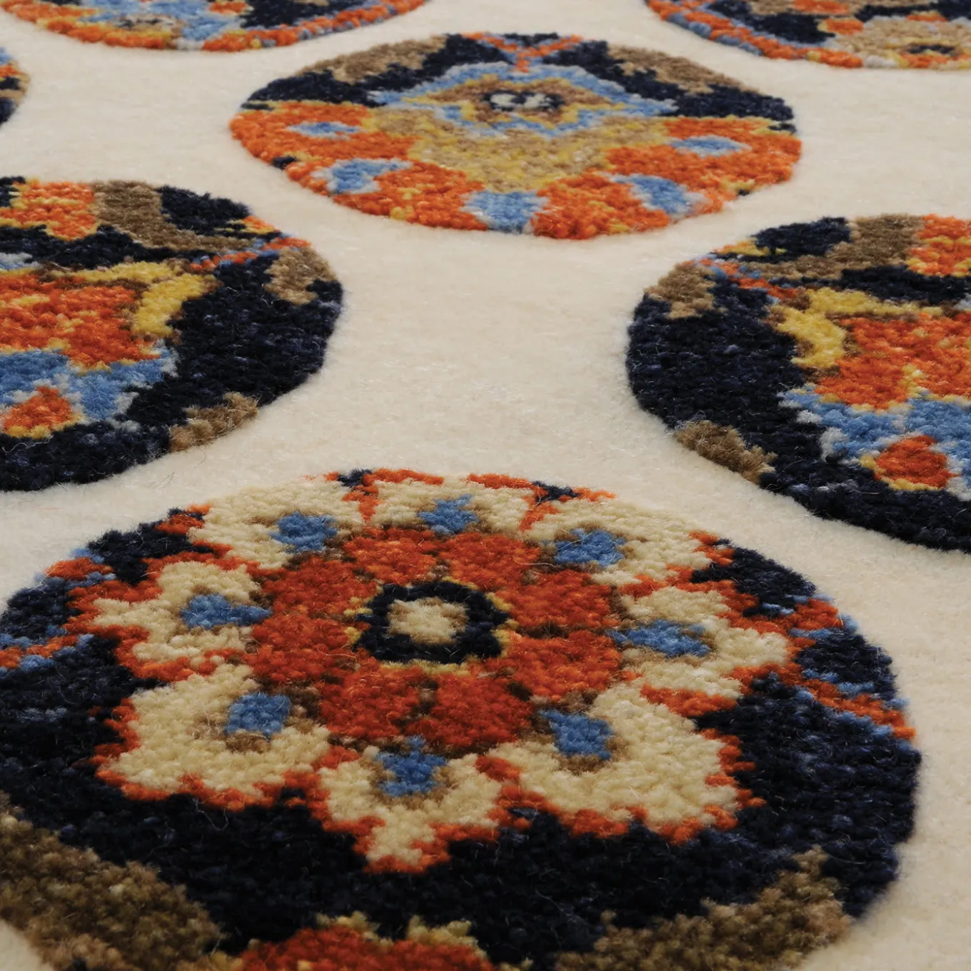 Questo elegante tappeto fa parte di una serie limitata di sette pezzi. Interamente annodato a mano in legno, questo oggetto decorerà un interno creando un effetto sorprendente, non solo per la sua squisita fattura, ma anche per la decorazione unica sulla sua superficie creata con una serie di pois che sembrano emergere da uno sfondo bianco. Il risultato è moderno e sorprendente e si adatta particolarmente a un arredamento contemporaneo.