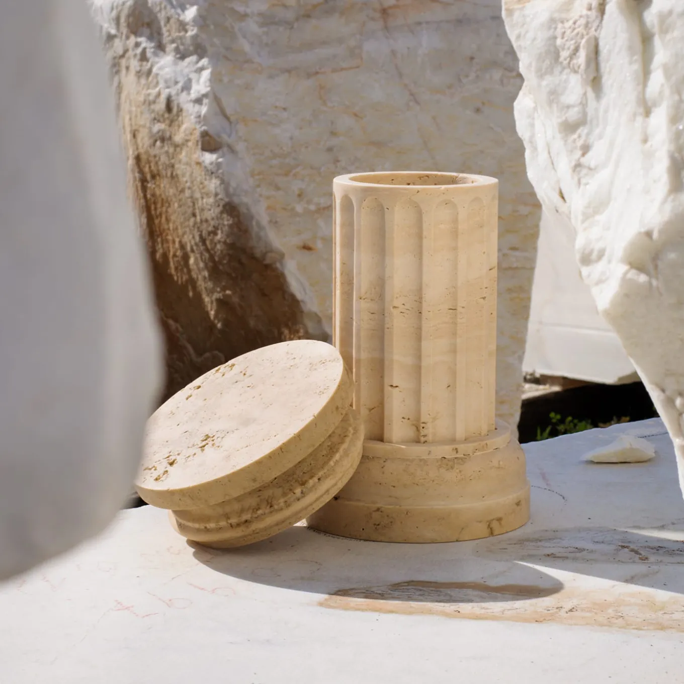 Il nome POR TAN TE sottolinea la natura modulare di questo vaso decorativo, in cui ogni parte può stare da sola come prodotto individuale o essere combinata con le altre per creare un pezzo coeso e multifunzionale. Progettato in collaborazione con SuonareStella, questo vaso è realizzato in marmo Travertino, un materiale che conferisce un’eleganza naturale e ogni pezzo è unico grazie alle sue caratteristiche venature. Ogni parte di questo vaso a colonna può essere venduta singolarmente.