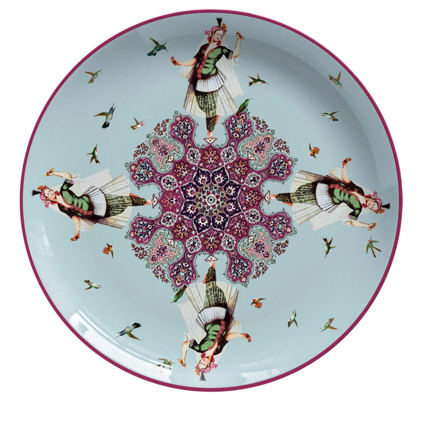 Un’aggiunta straordinaria e raffinata a qualsiasi casa, questo set unico comprende due piatti da dessert che aggiungeranno un tocco colorato e un delicato senso di movimento a qualsiasi tavola. Il set è stato realizzato in porcellana e fa parte della collezione Costantinopoli, ispirata al fascino misterioso ed esotico dell’antica capitale dell’Impero Bizantino e composta da 12 disegni combinabili tra loro. Questo è caratterizzato da un affascinante sfondo azzurro pallido ravvivato da colibrì colorati che volano intorno a quattro donne che danzano su una decorazione centrale astratta.