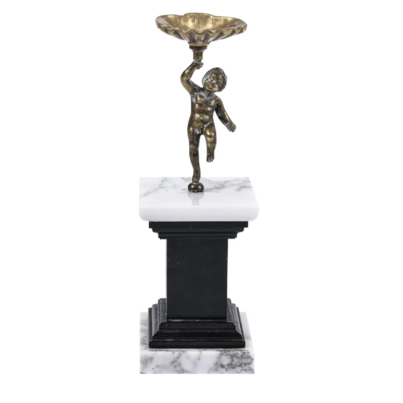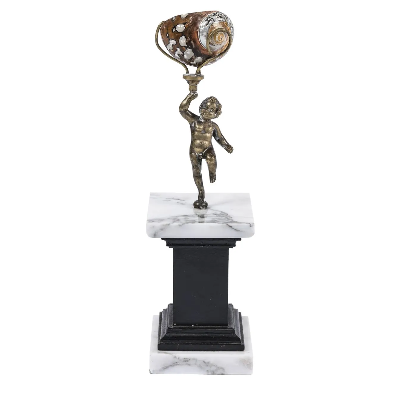 La combinazione di un tema decorativo classico e l’uso di materiali nobili rendono questo set di sali e pepiere un’aggiunta straordinaria a un arredamento tradizionale. La base, in legno con parte superiore e inferiore in marmo bianco di Carrara, ha la forma di un piedistallo del XVI secolo e sostiene la squisita scultura di un cherubino che salta e tiene in mano una magnifica conchiglia di nautilus montata in ottone (nel caso della saliera) e in ottone (per la pepiera). Aggiunto a una collezione personale o regalato, questo set sarà un pezzo superbo da tramandare per generazioni.
