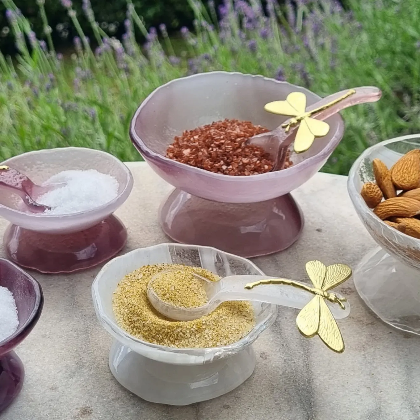 Scolpito a mano in modo impeccabile in vetro bianco cristallino di Murano, questo sofisticato set di due saliere darà un tocco elegante a un tavolo da pranzo moderno o tradizionale. Per presentare salse, intingoli, condimenti o per arricchire qualsiasi piatto, questi due pezzi versatili presentano una silhouette arrotondata su una raffinata base a piedistallo, insieme a un cucchiaio abbinato impreziosito da un’accattivante libellula in ottone. Misura 9 cm di diametro.