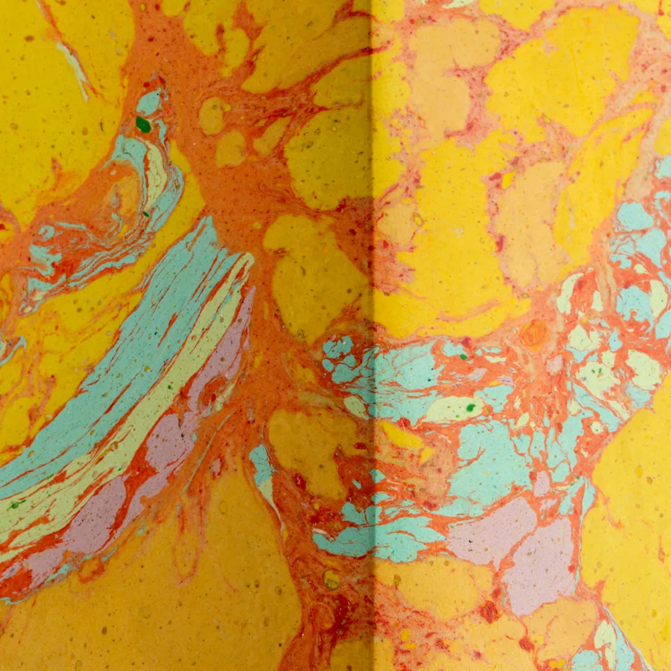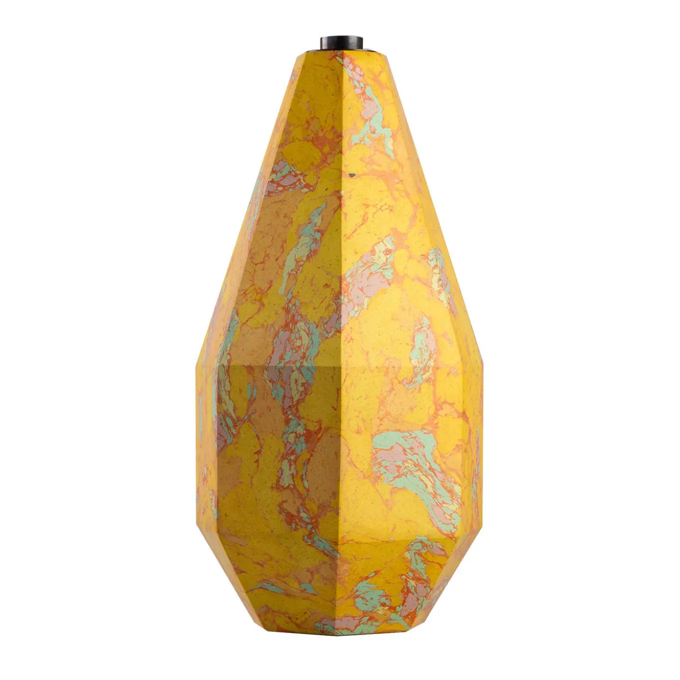 Candelabro a base ottagonale realizzato in Scagliola Carpigiana. Lavorato con colla e pigmenti naturali, il gesso è modellato per imitare le caratteristiche del marmo. La sede della candela è in ottone argentato con un diametro di 3 cm. La texture è caratterizzata da un giallo intenso con venature arancioni, intervallate da macchie azzurre e rosa. pezzo unico