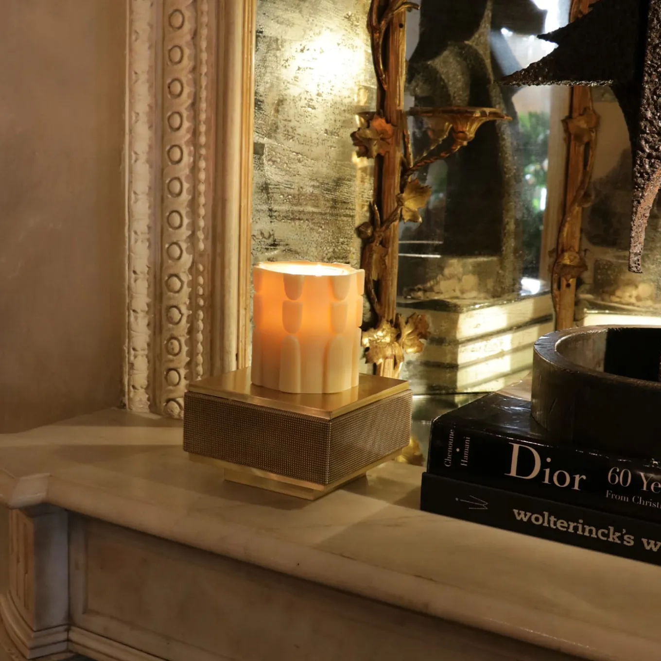 L’elegante base di questo prodotto è realizzata in ottone e la superficie principale è stata trattata con tecniche di brunitura e presenta una texture a diamante. La cera di paraffina con oli essenziali di Ambra e Oud garantisce alla candela un profumo prezioso.