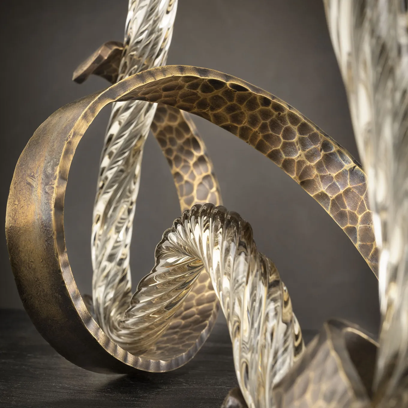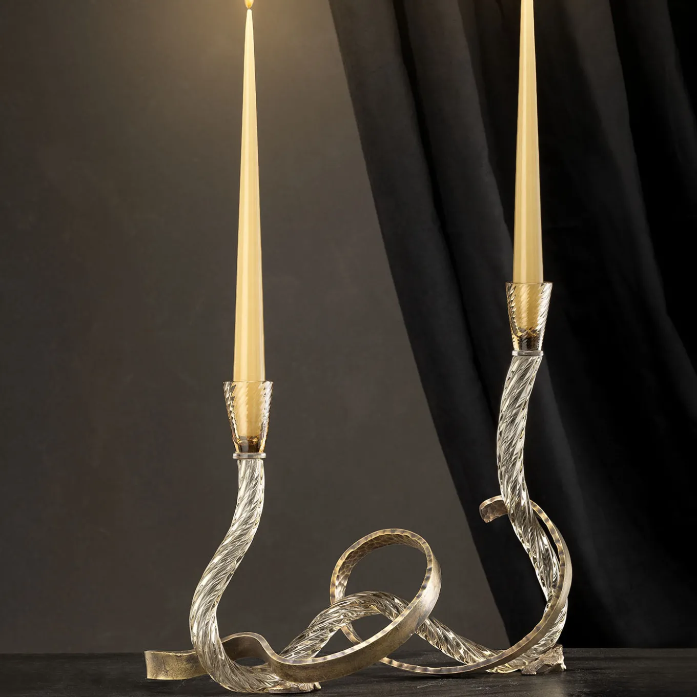 Il portacandele Ribbon in vetro di Murano presenta una silhouette fluida e sinuosa con accenti in ottone curvati a mano che creano un gioco artistico di forme e texture. Questo articolo offre due portacandele con un design unico che mette in risalto la ricca profondità e il colore del vetro veneziano abbinato alla finitura in ottone martellato, tattilmente piacevole. Il set include due candele ed è disponibile anche in nero per opzioni di decorazione versatili. Contattare il Concierge per ulteriori informazioni.