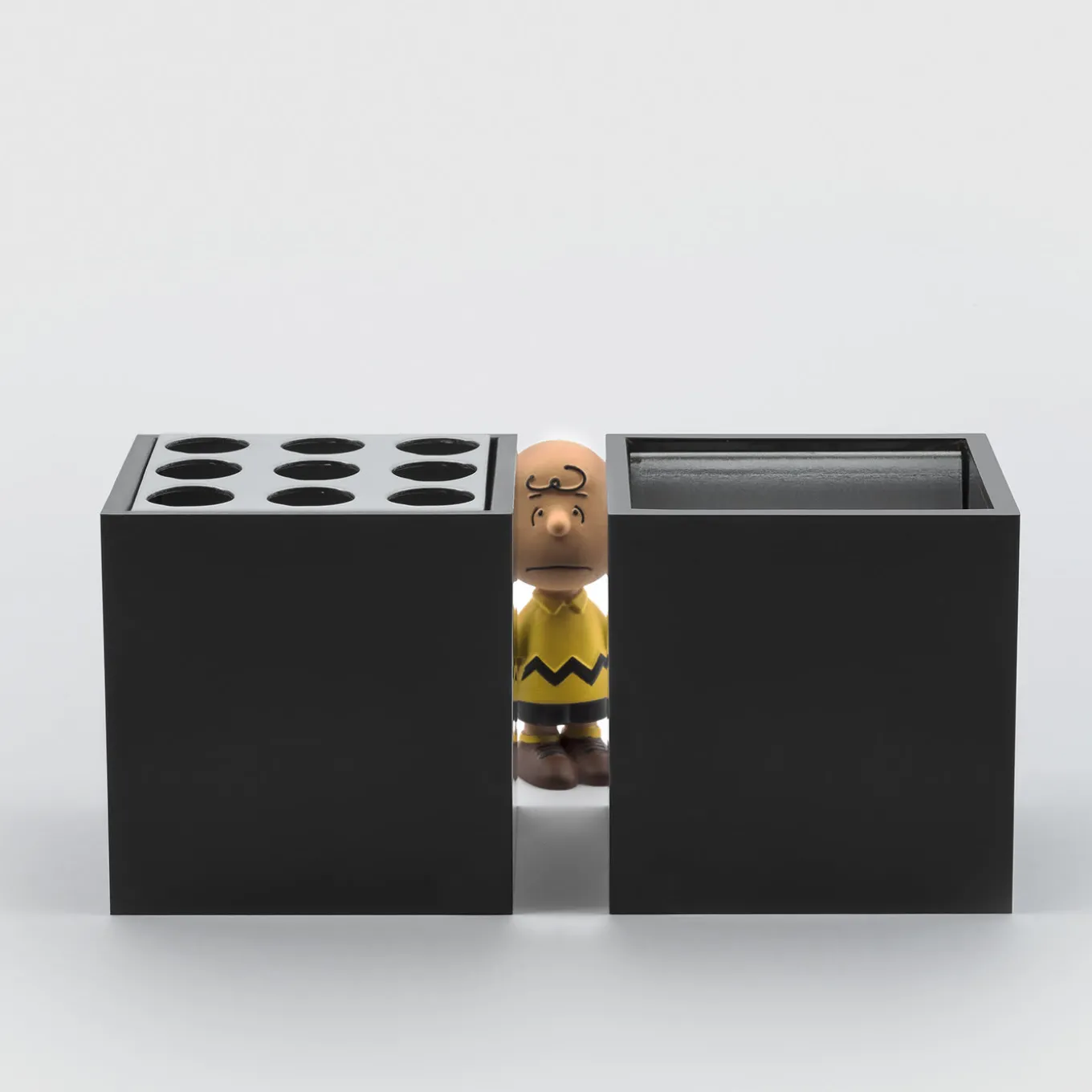 Un volume puro che racchiude un’anima multiuso. Questo design a forma di parallelepipedo in melamina nera non infiammabile presenta una struttura composta da due elementi che possono essere accostati l’uno all’altro per fungere separatamente da elegante portamatite e da porta graffette, oppure possono essere impilati per nascondere completamente gli oggetti ospitati e svolgere una funzione puramente decorativa e sobria. L’interno è in alluminio anodizzato fumé.