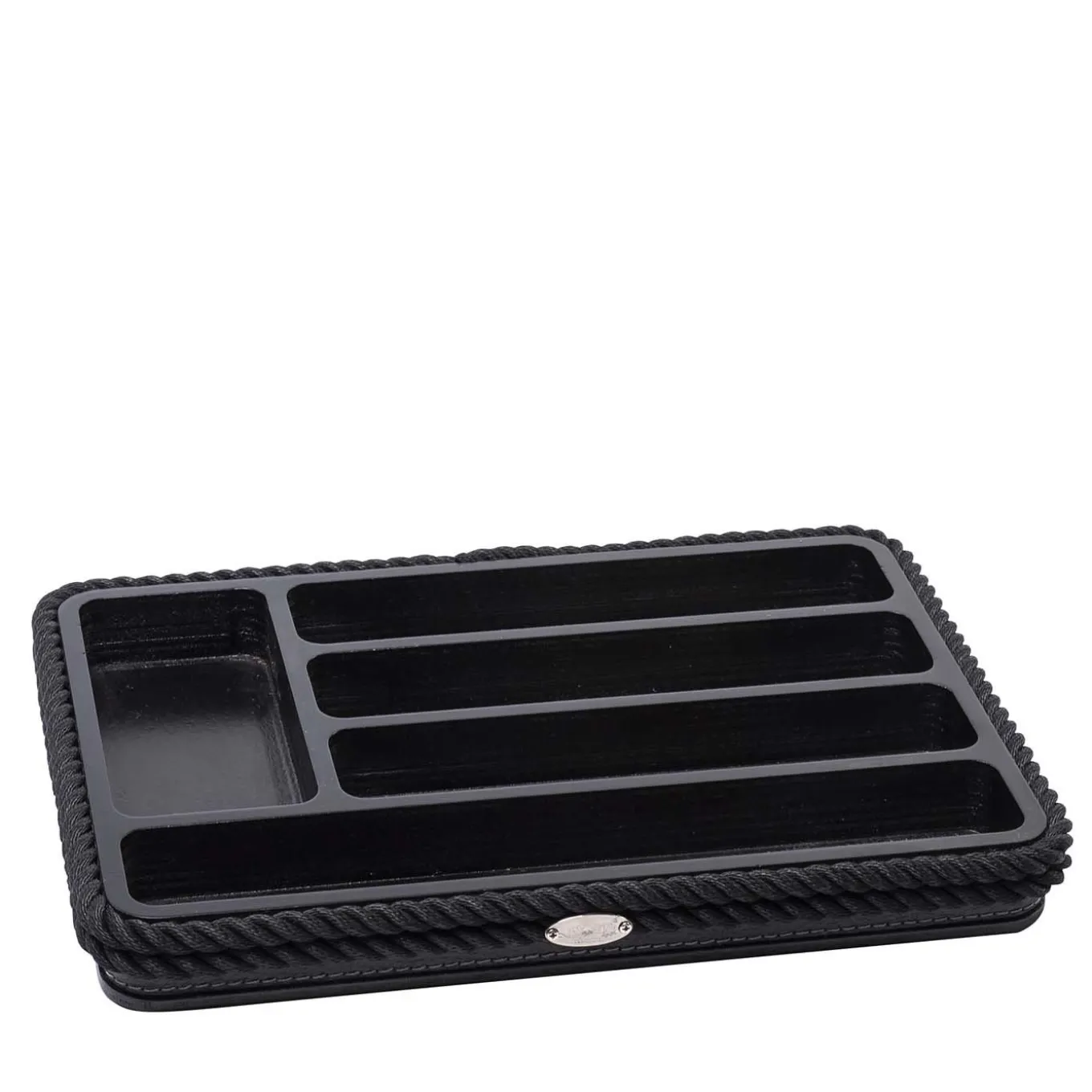 Perfetto per riporre elegantemente l’argenteria in qualsiasi arredamento, ma che si integra perfettamente in contesti nautici raffinati, questo design offre cinque scomparti di forme diverse. Realizzato in legno di prima qualità laccato in nero, il portaposate presenta un bordo superiore delineato da una spessa corda in tinta per un look coerente e sofisticato, e una superficie esterna rivestita in pregiata pelle nera.