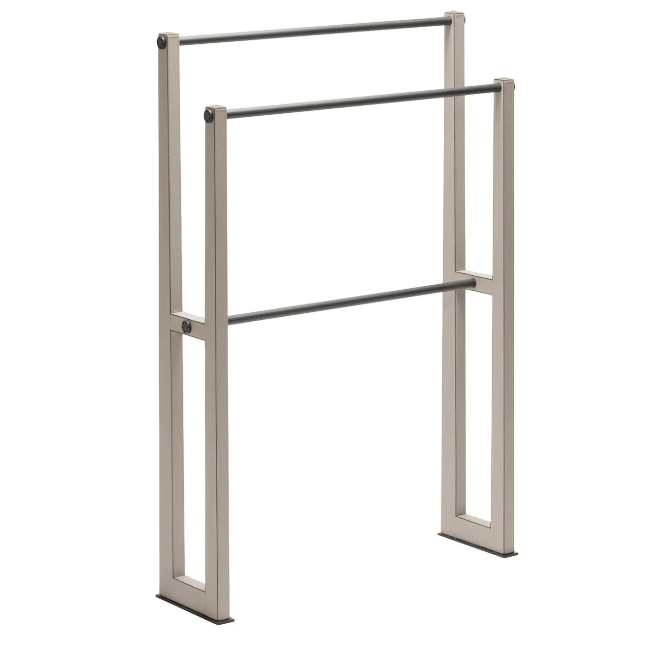 Aggiunta elegante e raffinata a un bagno minimalista o contemporaneo, questo portasciugamani presenta una splendida combinazione di materiali, linee eleganti e tonalità. Presenta una struttura in legno squisitamente rivestita in pelle di colore grigio chiaro, arricchita da tre barre metalliche orizzontali disponibili in finitura cromo, bronzo o ottone su richiesta. Sono disponibili anche altre dimensioni; per ulteriori dettagli e opzioni di personalizzazione, consultare il Concierge.
