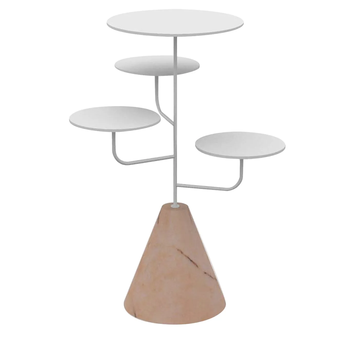 Questo seducente portavivande a quattro livelli sintetizza funzionalità ed estro decorativo, grazie alla sapiente armonia tra una struttura in ferro laccata in bianco, elegantemente minimalista, e un’opulenta base conica in marmo Pink Portogallo. La struttura si dirama in quattro bracci che incorporano altrettante superfici rotonde, per un’esposizione dinamica dei cibi che si vogliono servire durante un pasto o un aperitivo alla francese. Per altre tonalità e marmi disponibili, rivolgersi al Concierge.