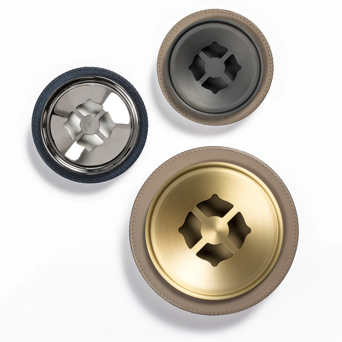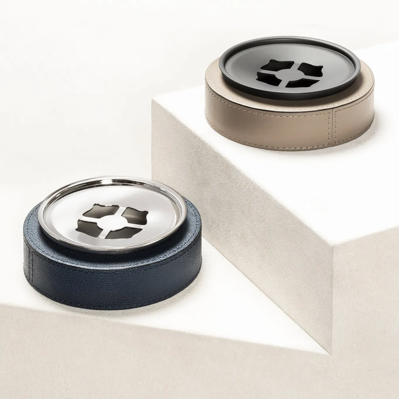 Struttura in legno rivestita in pelle. Posacenere in ottone rimovibile disponibile in tre finiture. Finiture metalliche disponibili: cromo / bronzo / ottone.