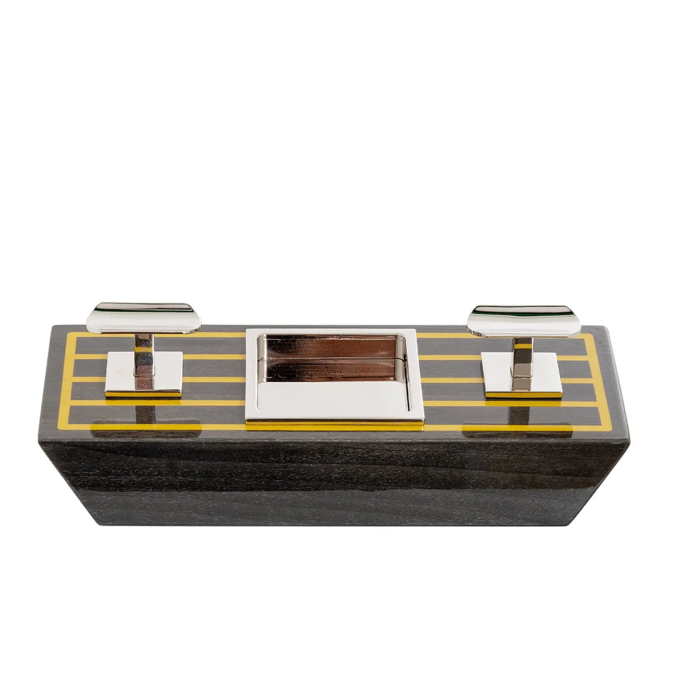 Dalla collezione Yacht, il nostro posacenere doppio Dolcevita è il dettaglio perfetto per qualsiasi ambiente di lusso. Il posacenere è verniciato totalmente a specchio e impreziosito da un supporto e da un vassoio in ottone massiccio placcato oro 24k o palladio. Le caratteristiche tecniche sono il toulipier grigio con dettagli in intarsio di tay giallo. La finitura lucida è il dettaglio perfetto per far brillare questo elegante oggetto. Due supporti per sigari in ottone massiccio placcato oro 24k/palladio sono posizionati su ciascun lato del posacenere.