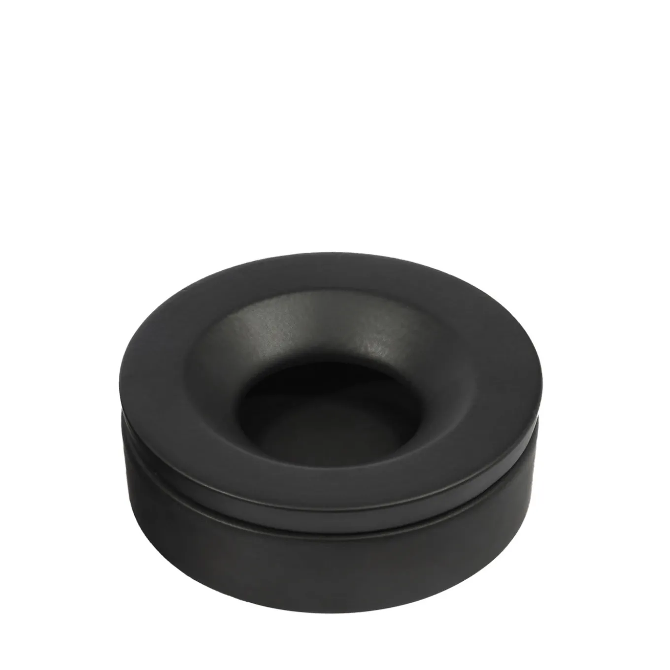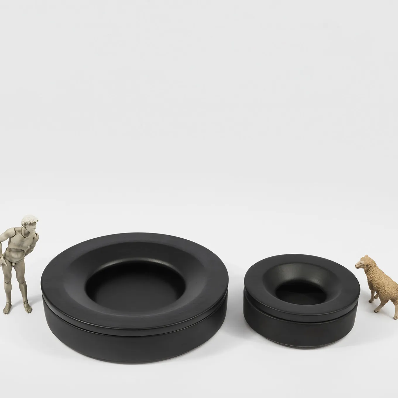 Il fascino puro e disadorno di questo posacenere disegnato da Angelo Mangiarotti si sposa perfettamente con la sua funzione elementare, elevando il gesto del fumare a una conclusione nobile e discreta. Realizzato in ceramica smaltata nera, il design è composto da una base su cui è incastonato un elemento ad anello coordinato con una spessa fascia disegnata per nascondere parte del contenuto.