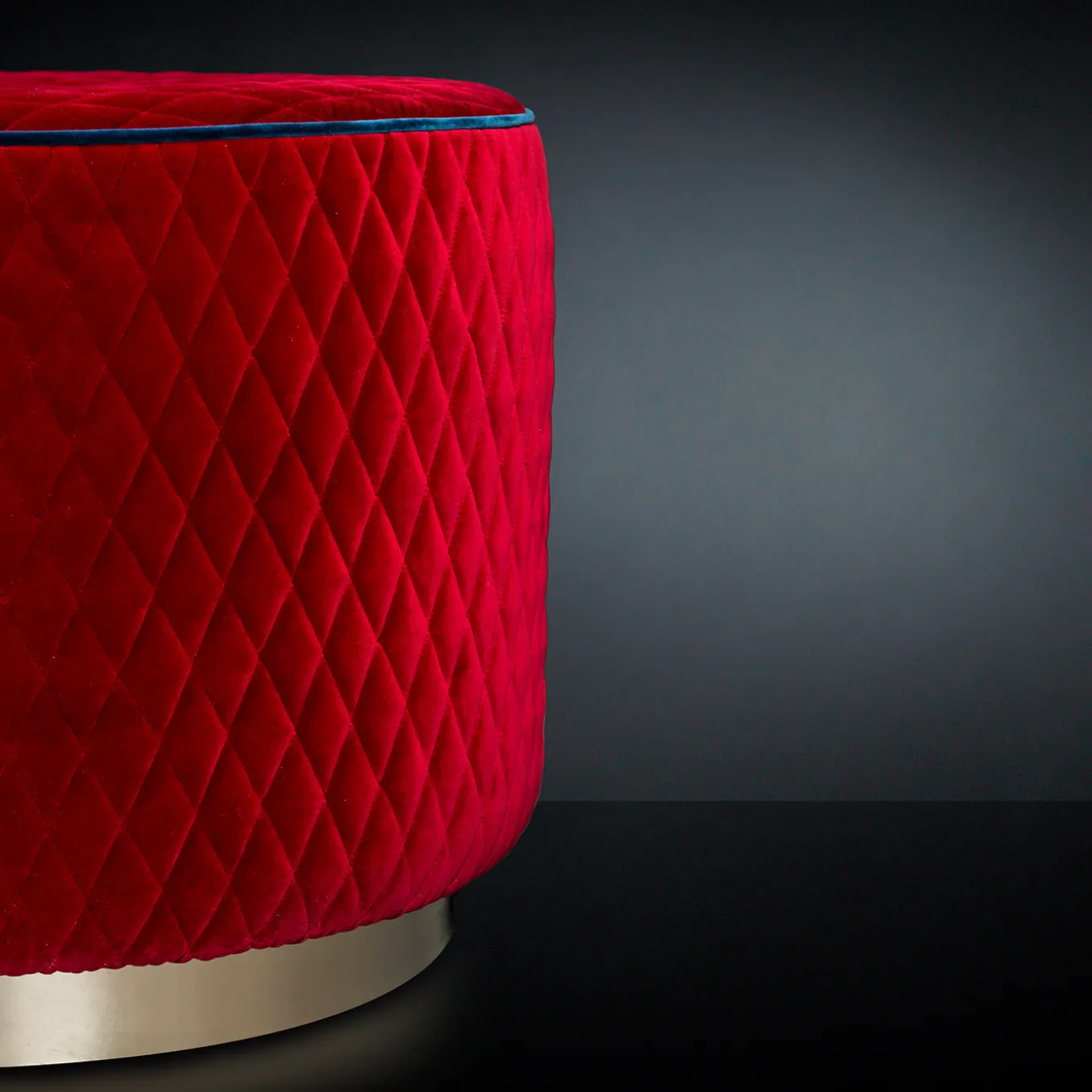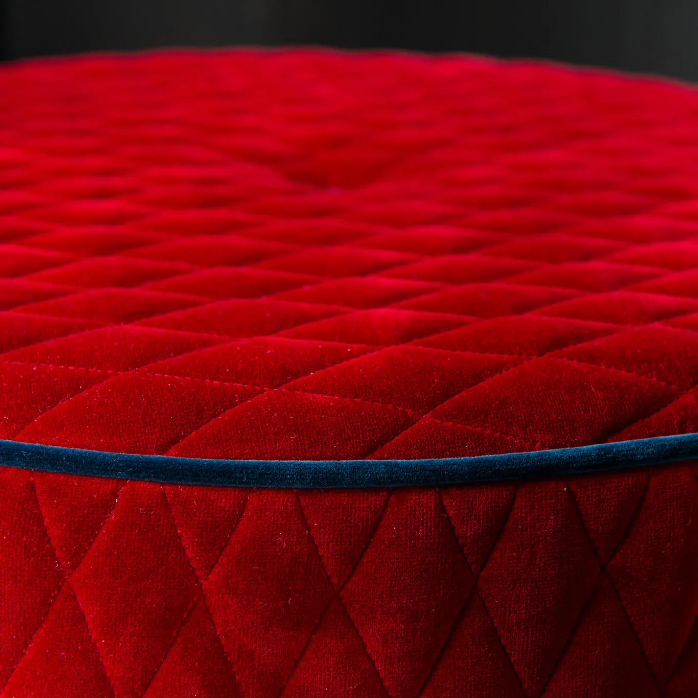 Questo sofisticato pouf rotondo spicca in qualsiasi arredamento aggiungendo un tocco glamour. Ispirato allo spirito della Belle Époque del XIX secolo, questo pezzo di arredamento funzionale ne cattura l’eleganza unica e lo stile romantico. Sostenuto da una base a plinto con finitura dorata anticata che completa il tessuto rosso morbido e vellutato e le bordature blu, il motivo grafico e intricato a spina di pesce trasmette un senso di lusso. Utilizzato come seduta o tavolo con un vassoio in cima, questo pouf accentua qualsiasi salotto o camera da letto. Tappezzeria e dimensioni personalizzabili su richiesta. Su richiesta, sono disponibili certificazioni per il settore contract e commerciale.