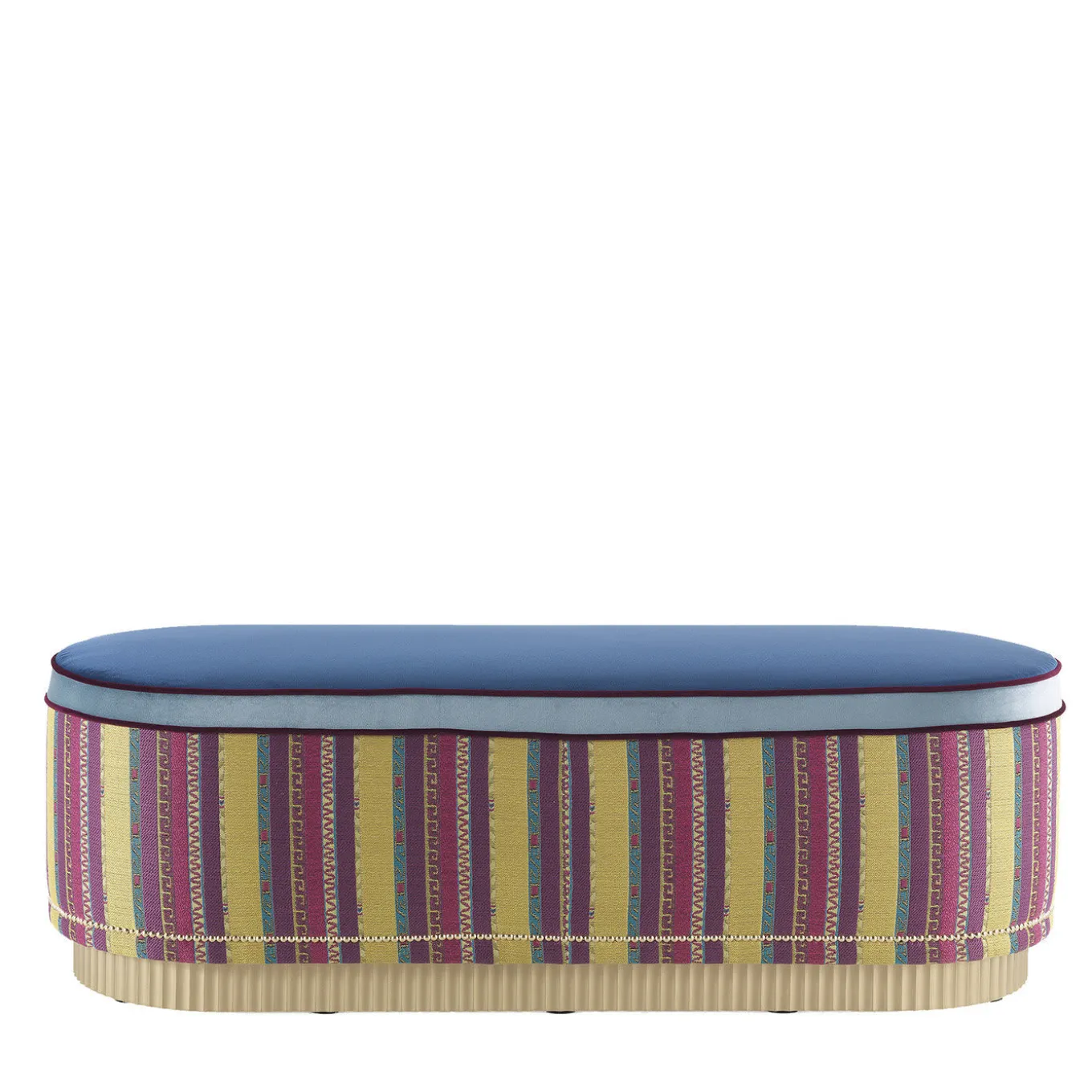 Un pouf lungo colorato e creativo per arricchire e decorare il vostro angolo relax. Disponibile con diversi rivestimenti nei tessuti etnici della collezione, il pouf è impreziosito da chiodi dorati ornamentali sul fondo e dalla base plissettata laccata oro. Struttura in legno e schiuma. Fianchi in tessuto cat. A Khorat col. 1 Overdose. Seduta in velluto cat. A Venezia col. 8 Baltico. Fascia sottosedile in velluto cat. A Venezia col. 11 Sky. Piping in velluto cat. A Venezia col. 15 Cardinale. Chiodi ornamentali dorati sul fondo. Base plissettata in legno laccato oro. Chiedere al Concierge per varianti personalizzate.