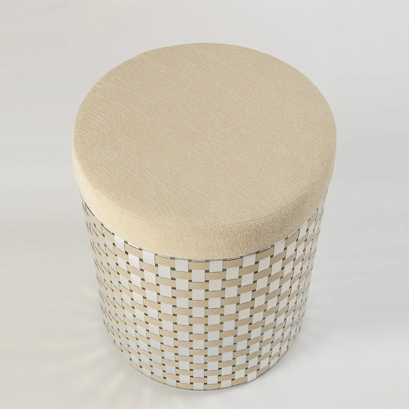 Questo pouf, un pezzo d’accento straordinario per un interno moderno, presenta un design singolare ispirato al movimento Optical Art degli anni ’60. La sua silhouette cilindrica è completata da un raffinato cuscino rotondo beige. Magnificamente realizzato in Splot, una rete intrecciata di doghe in alluminio dorato e naturale, la sua silhouette cilindrica è completata da un raffinato cuscino rotondo beige. Chiamato così in onore di Vesta, la bontà greca del focolare, questo splendido design porterà un’atmosfera calda in salotto.