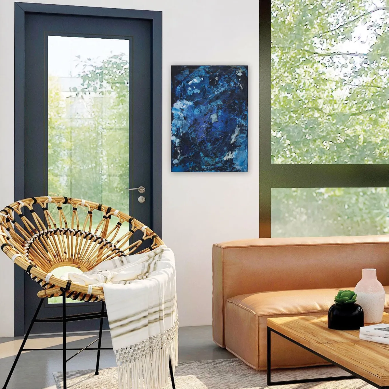 Una qualità testuale, quasi tridimensionale, definisce questo splendido dipinto, il cui motivo astratto riflette la forza espressiva di un singolo, impercettibile momento. L’accattivante caos di pennellate acriliche e inchiostro dai toni blu si adagia sui molteplici strati di carta velina che aderiscono alla tela grazie a colle di origine vegetale, conferendole una piacevole sensazione tattile. L’opera viene consegnata senza cornice e viene fornita con un certificato di autenticità.