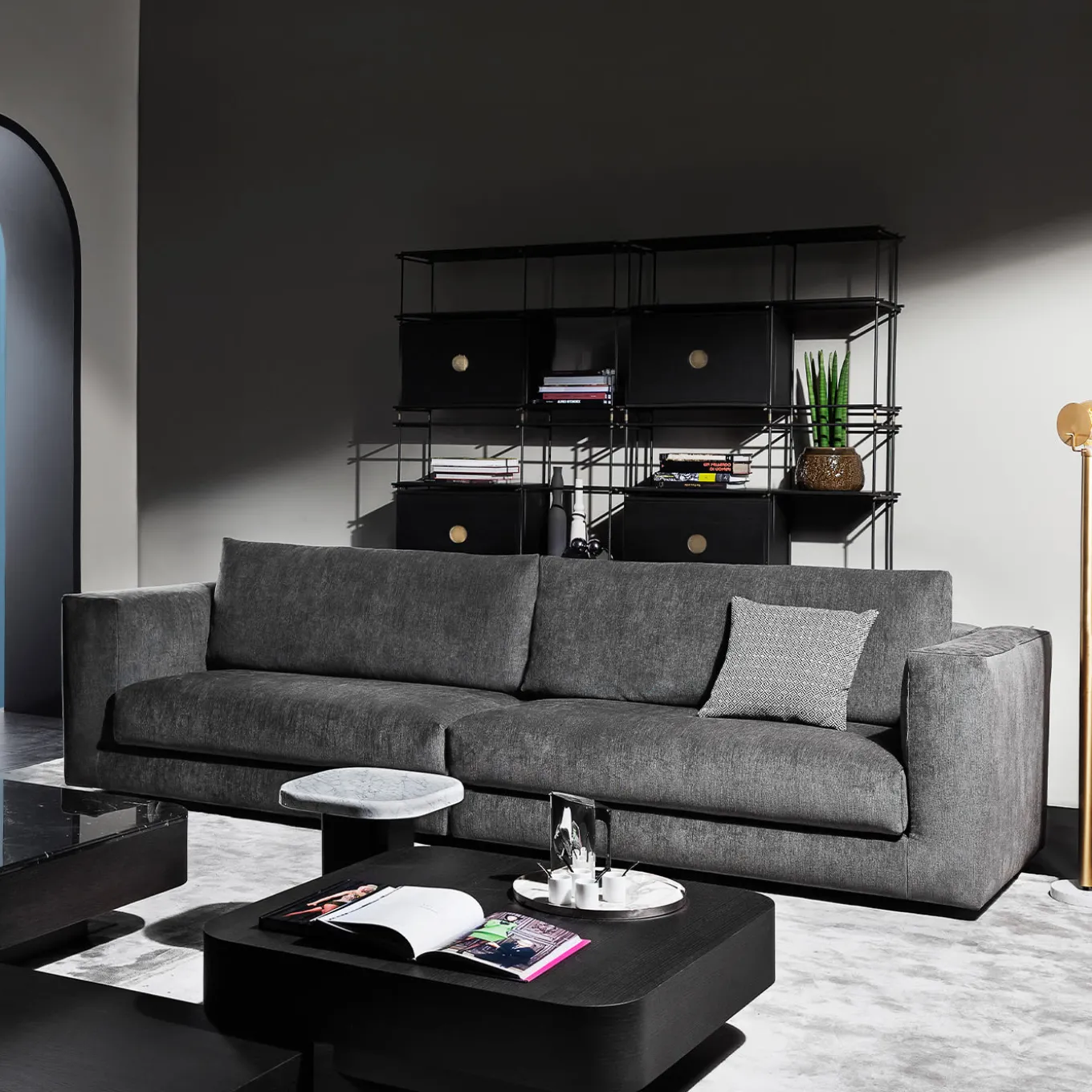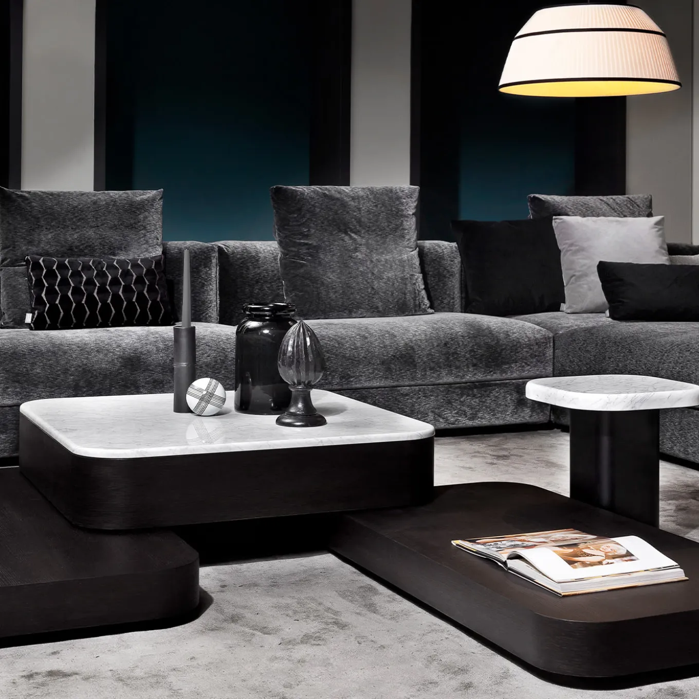 Questo prezioso set di quattro tavolini d’accento creerà una composizione d’impatto in un arredamento moderno. Ogni tavolo ha una struttura in legno indipendente ed è caratterizzato da una forma squadrata ammorbidita da angoli arrotondati. È composto da un tavolo basso rettangolare in rovere (120L x 60L x 13H cm) in finitura grigio tinto, due tavoli quadrati (90L x 90L x 32H cm) con base laccata nera e piano rispettivamente in marmo bianco Carrara e nero Marquina, e un tavolino (18L x 38L x 42H cm) con piano in marmo bianco Carrara. I piani sono disponibili in altre finiture.