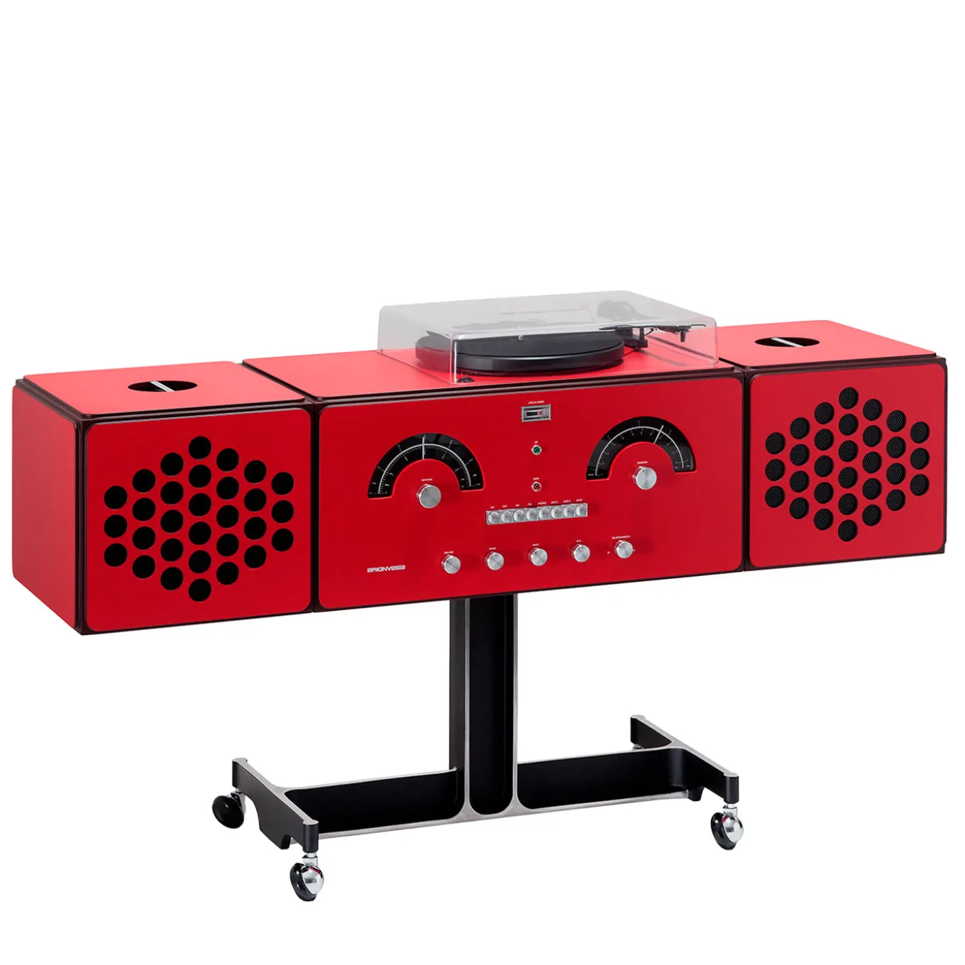 Dinamico e innovativo, con un accento di raffinatezza vintage, questo radiogramma è un progetto del 1965 di Achille e Pier Giacomo Castiglioni. Realizzato con maestria da mani esperte, questo pezzo singolare è realizzato in legno laccato rosso e alluminio. Poggiato su ruote girevoli per facilitarne l’uso e la trasportabilità, è dotato di altoparlanti regolabili, sistema radio AM/FM, giradischi e ingressi AUX.È possibile collegare altre sorgenti e altri sistemi per ricevere segnali audio tramite Wi-Fi e Bluetooth (attraverso dispositivi esterni, non inclusi nel prezzo).