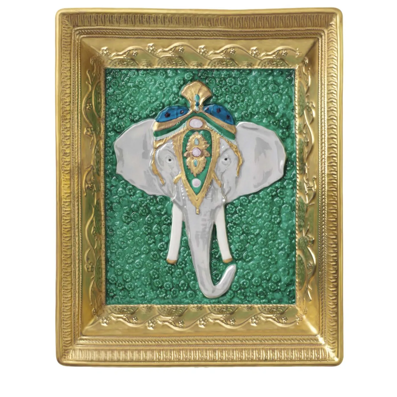 Quest’opera d’arte unica è un sublime omaggio allo splendido paesaggio del Rajasthan, uno stato dell’India settentrionale. Il pezzo è realizzato in porcellana fine e splendidamente ornato da colori vivaci, che evidenziano la squisita raffigurazione della testa di un elefante. Lo sfondo turchese è un contrasto vibrante con gli accenti blu e grigio perla e con la placcatura in oro 24 carati, che orna anche il bordo del pezzo.