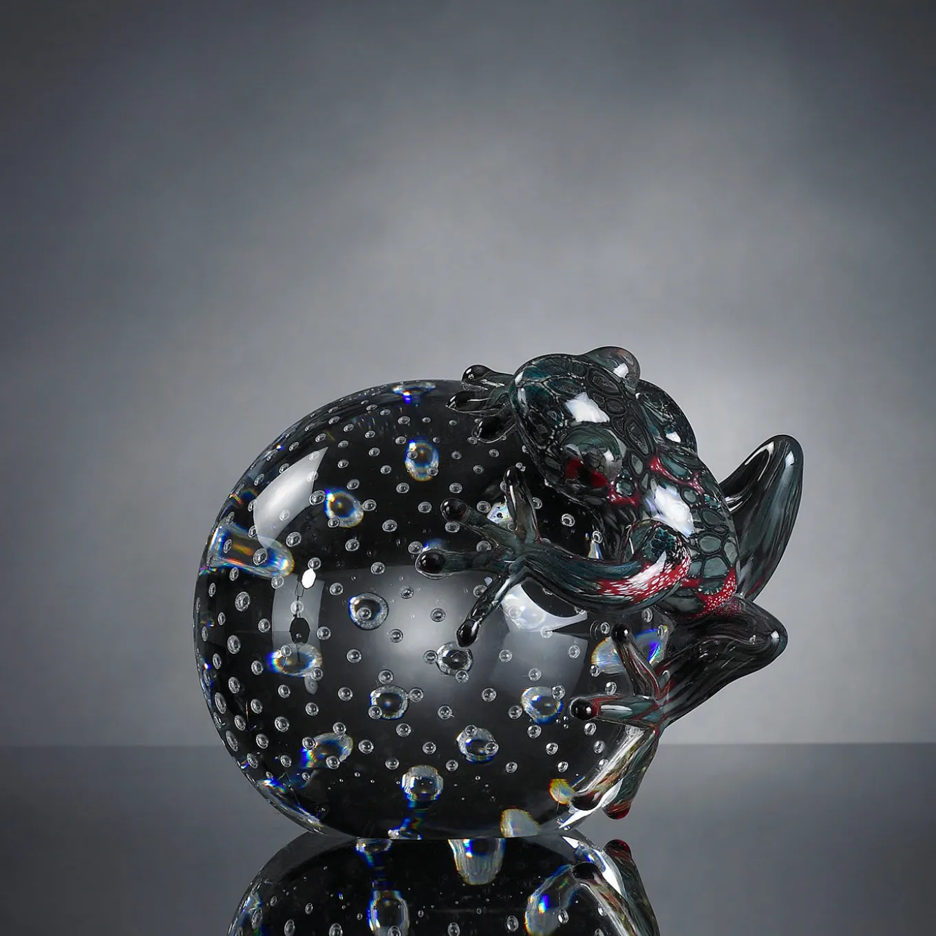 Caratterizzata da un uso unico del colore, questa statuetta presenta una rana verde petrolio dalle sfumature sorprendenti che poggia su una sfera trasparente arricchita da bolle danzanti racchiuse tra gli strati di vetro. Questo oggetto d’arte scultoreo è interamente realizzato a mano in vetro da maestri artigiani.