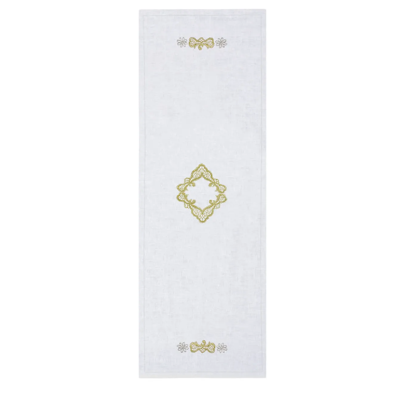 Lunghe ore di paziente ricamo manuale sono all’origine di questo luminoso runner da tavola in lino bianco, i cui ricami in cotone Mako dorato traggono ispirazione dai tradizionali merletti pugliesi denominati Rinascimento. Ricco di classe senza tempo, ogni pezzo è la testimonianza di una preziosa tradizione artigianale. Molteplici varianti di colore sono disponibili nel catalogo Artemest.