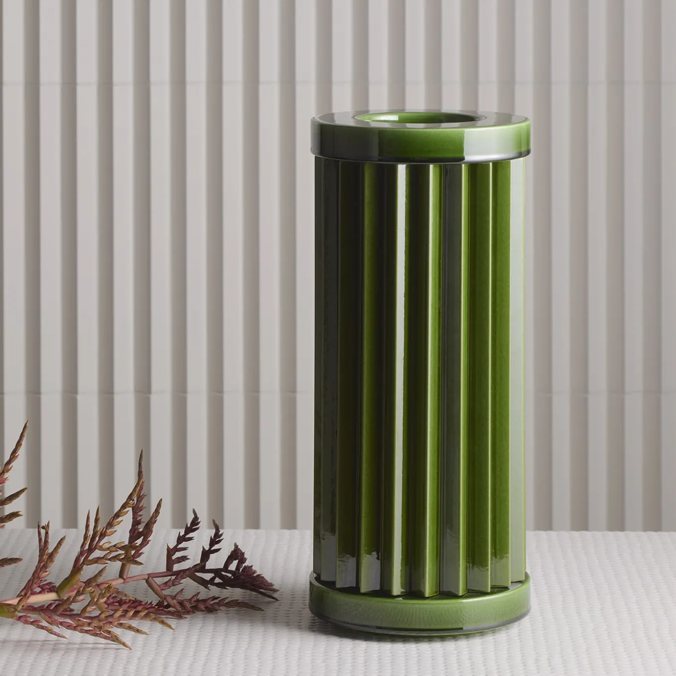 Un design unico e sofisticato, dal valore architettonico elegante e senza tempo, questo vaso appartiene alla serie di vasi scultorei Rombini, disegnati da Ronan & Erwan Bouroullec e realizzati artigianalmente in ceramica in collaborazione con Bitossi. Rifinito a mano in una tonalità verde totale dall’aspetto lucido, esalta la sua forma cilindrica plissettata. Disponibile in un’ampia gamma di colori e composizioni, consultare il catalogo Artemest per le opzioni.