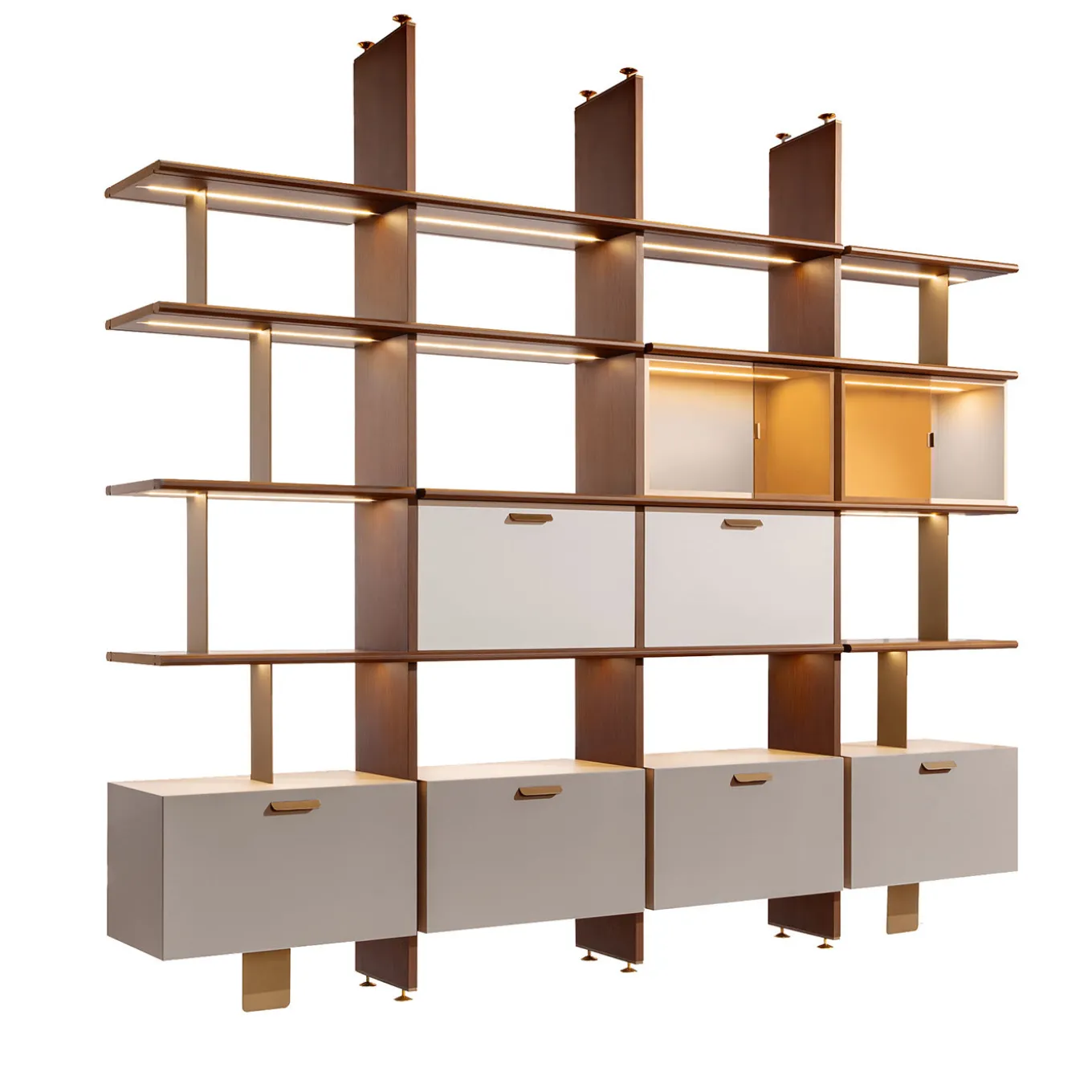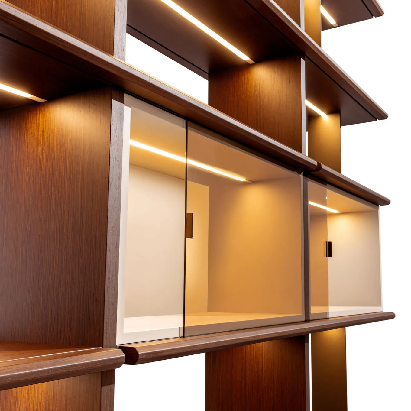 Questo splendido sistema di scaffalature, che attira l’attenzione su libri e altri oggetti da collezione, combina un’abile maestria tradizionale con un tocco contemporaneo e pulito. Realizzato in noce canaletto opaco con finitura caffè, presenta scomparti chiusi e aperti arricchiti da un sistema di illuminazione a LED opzionale. Personalizzabile nelle dimensioni e nelle finiture, si prega di consultare il Concierge per i dettagli.