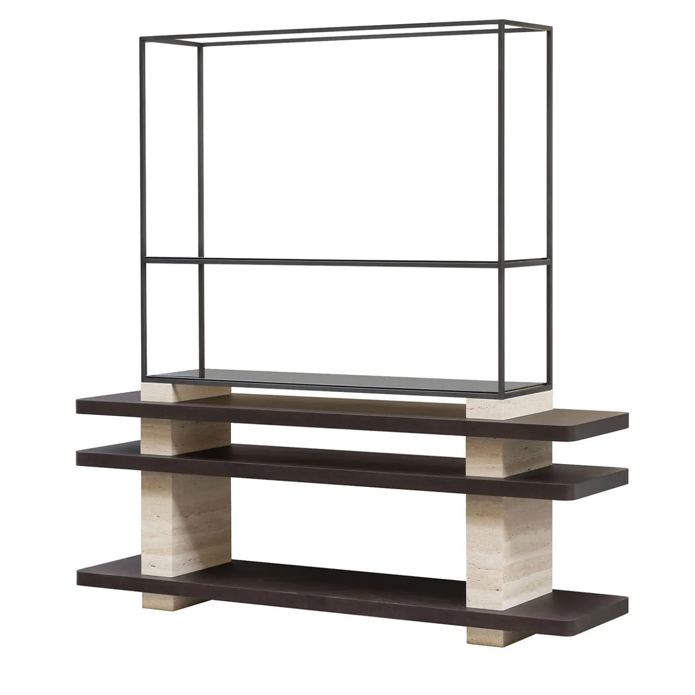 Elliot è una collezione di mobili massicci fatti di volumi altamente geometrici che si intersecano tra loro. Ogni creazione è quindi un pezzo monolitico che gioca con il contrasto, la consistenza, il colore e la luce. Base in legno parzialmente rivestita in pelle con gambe laterali in travertino monolitico. Su richiesta sono disponibili diverse finiture di travertino e legno. Su richiesta, sono disponibili dimensioni personalizzate.