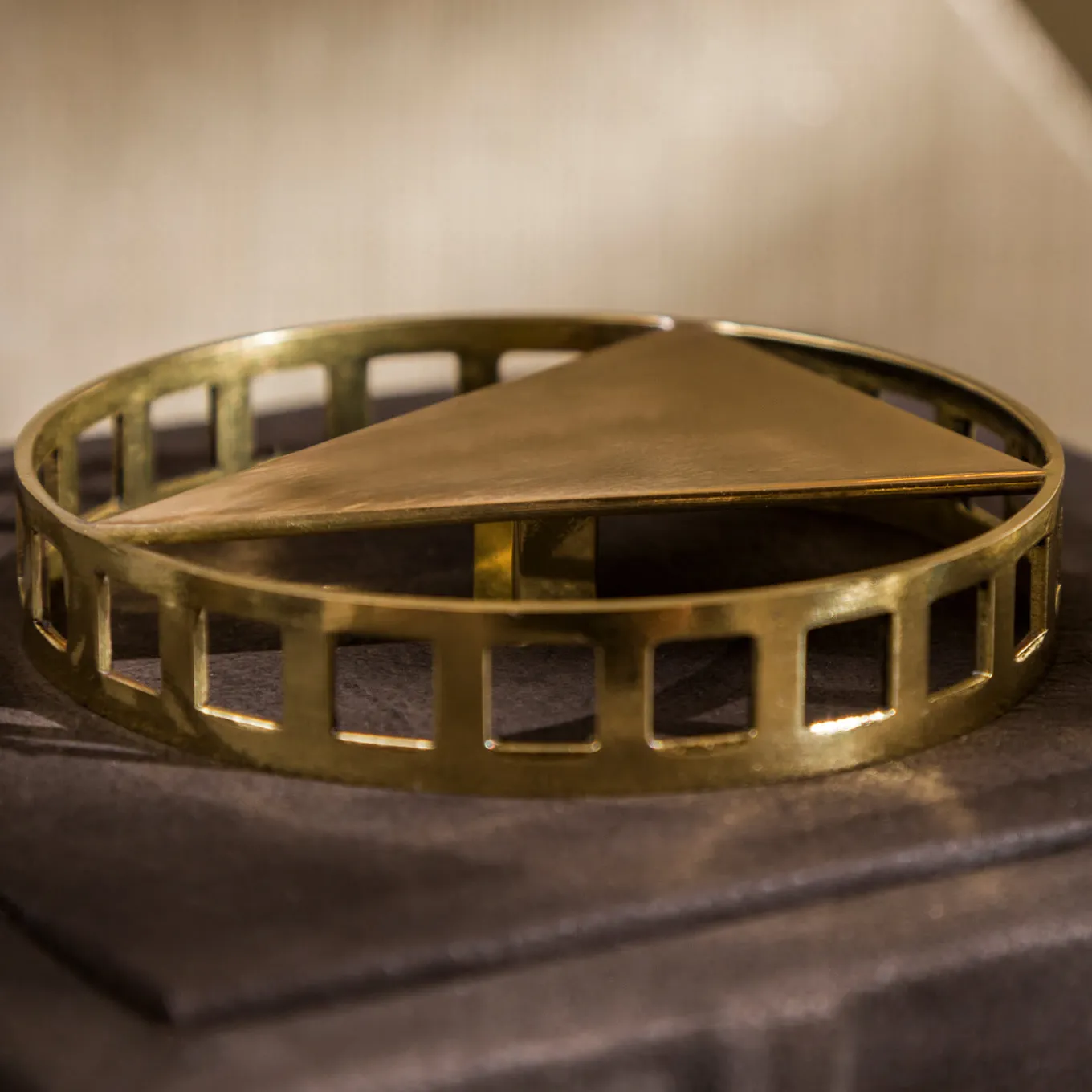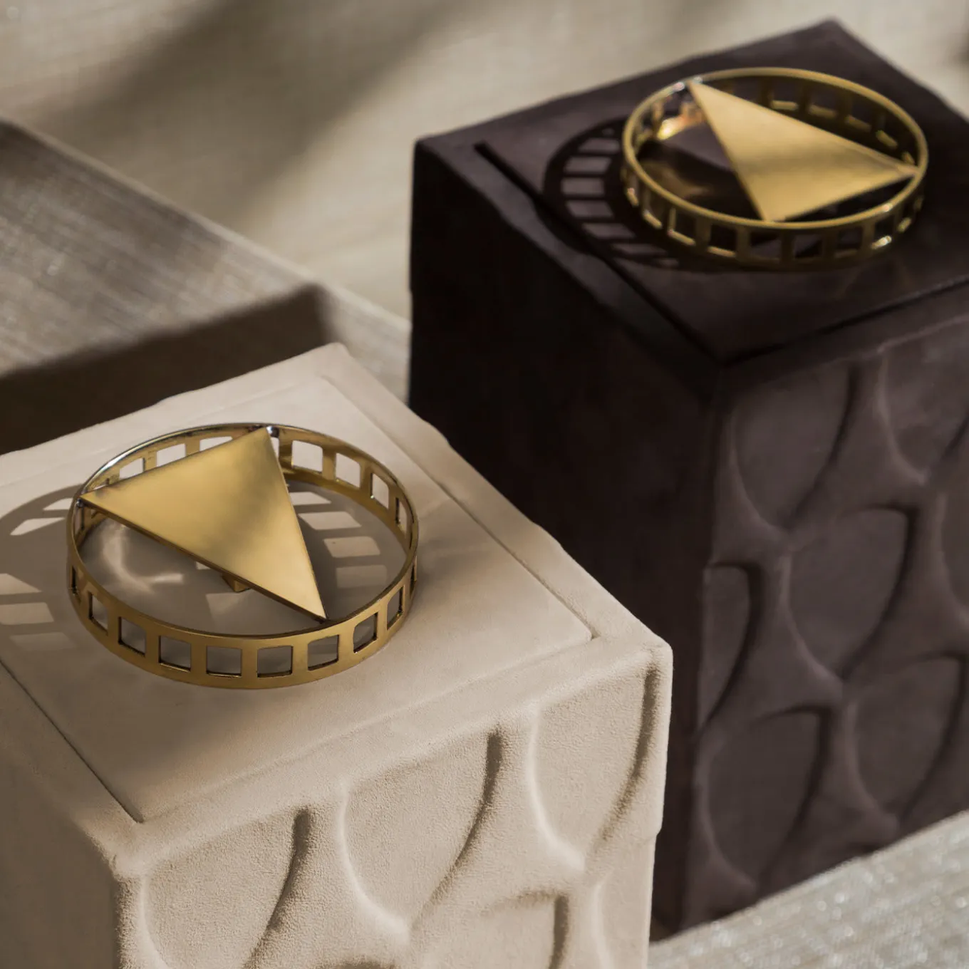Sapiente sintesi di riferimenti architettonici, questo superbo cofanetto presenta una robusta struttura in legno a forma di parallelepipedo segnata da una ripetuta trama tettonica – un omaggio al Brutalismo – che viene esaltata dalla pregiata pelle Nubuck marrone scuro che lo avvolge completamente come un abito di classe. Il pomello in ottone, simile a un gioiello, permette di sollevare il coperchio per rivelare la lacca arancione interna, suggerendo un elegante riferimento all’architettura della Yale University Art Gallery di Louis Kahn.