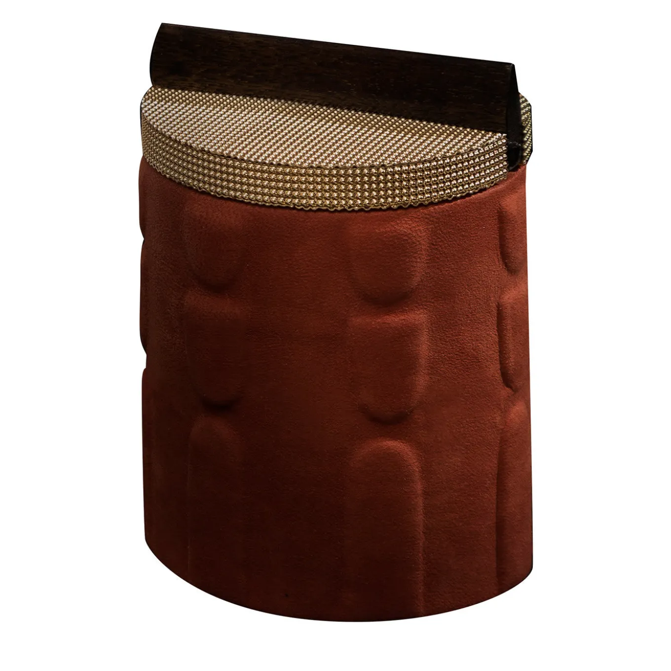 Questo esclusivo cofanetto artigianale della Collezione Bacabs è un’aggiunta impeccabile a una collezione personale di contenitori di lusso per gioielli. Il suo corpo cilindrico in massello di noce canaletto è arricchito da sagome in rilievo prese in prestito dall’arte precolombiana e impreziosito dal prezioso rivestimento in pelle Nubuck color corallo per un tocco seducente. Una lineare maniglia in legno – che celebra le linee razionaliste – divide in due metà semicircolari il coperchio in ottone a maglie luminose.